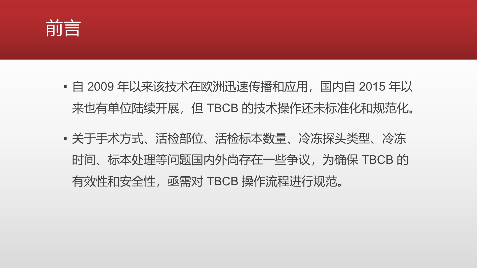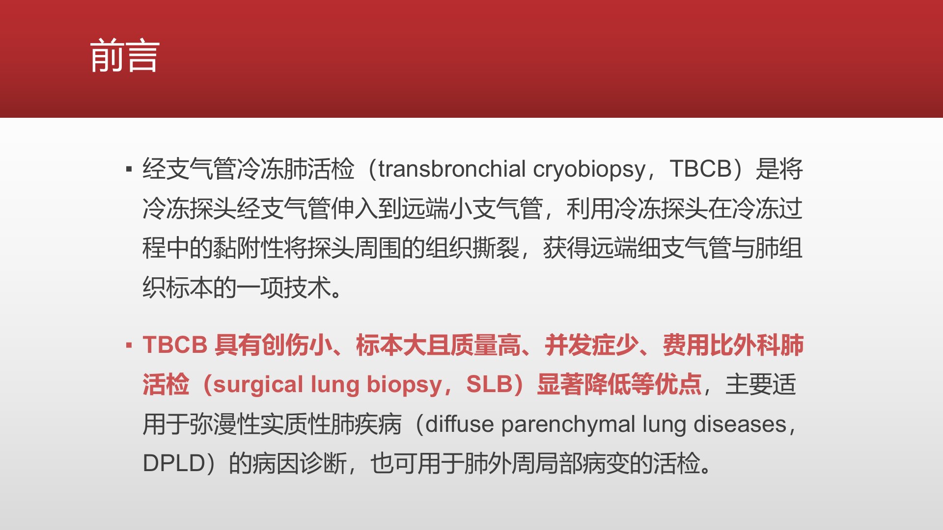 经支气管冷冻肺活检标准操作规范前言经支气管冷冻肺活检(transbronchialcryobiopsy,TBCB)是将冷冻探头经支气管伸入到远端小支气管,利用冷冻探头在冷冻过程中的黏附性将探头周围的组织撕裂,获得远端细支气管与肺组织标本的一项技术。TBCB具有创伤小、标本大且质量高、并发症少、费用比外科肺活检(surgicallungbiopsy,SLB)显著降低等优点,主要适用于弥漫性实质性肺疾病(diffuseparenchymallungdiseases,DPLD)的病因诊断,也可用于肺外周局部病变的活检。前言自2009年以来该技术在欧洲迅速传播和应用,国内自2015年以来也有单位陆续开...