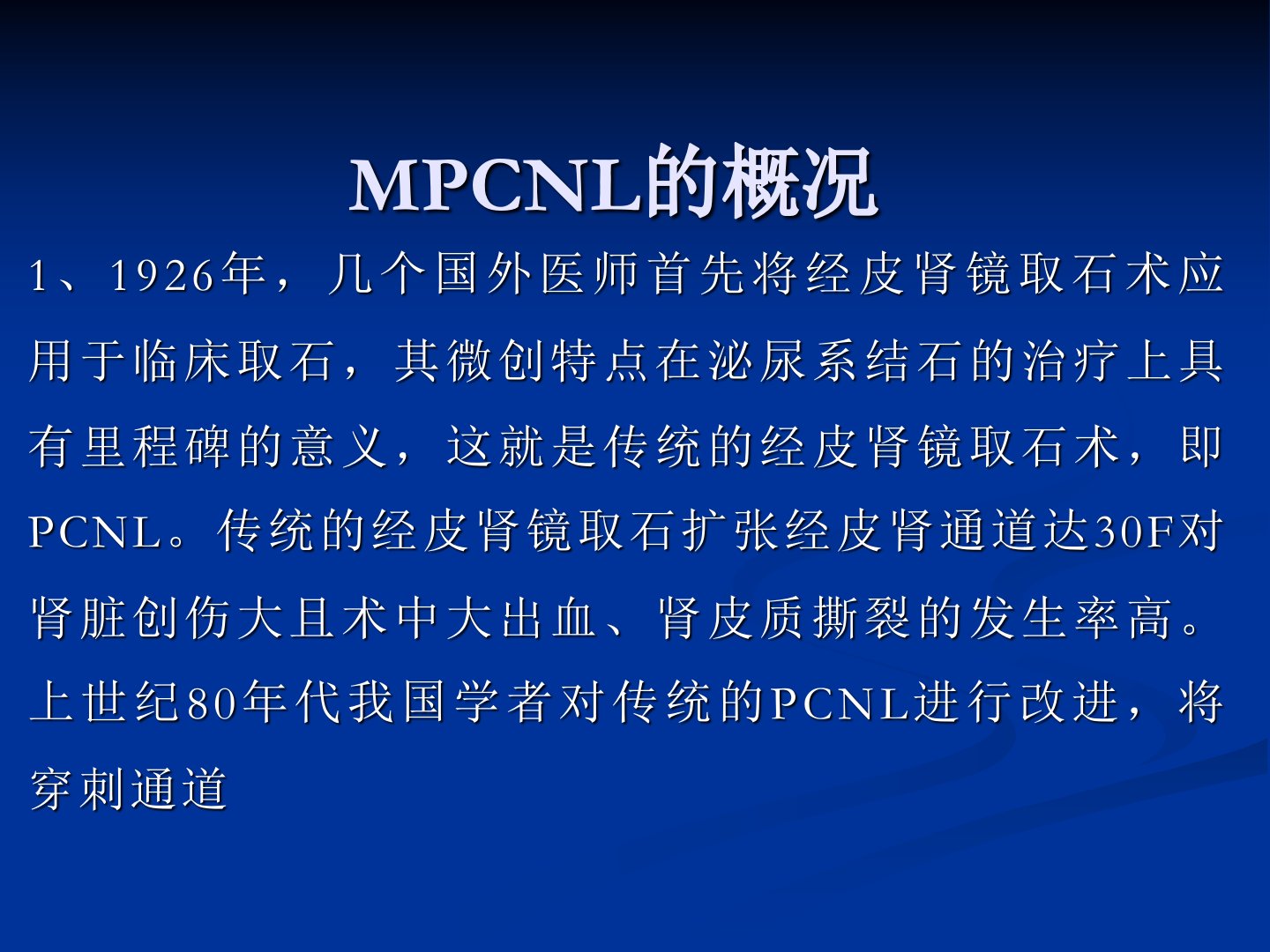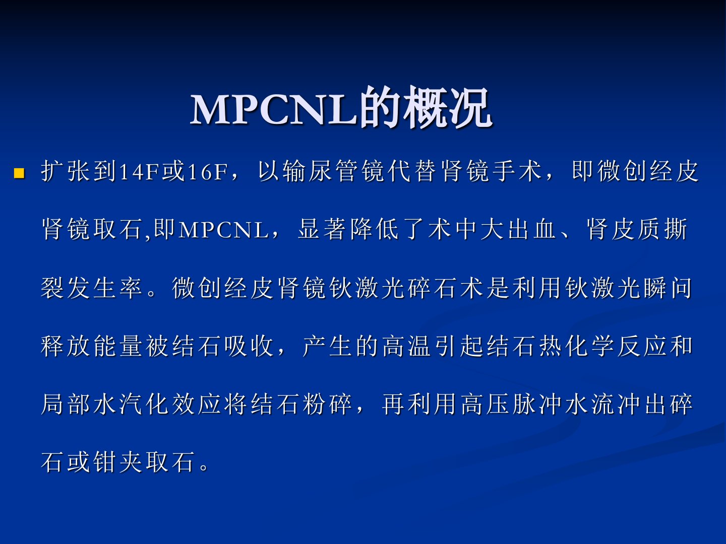 经皮肾右肾多发结石钬激光碎石术护理查房摘要本文详细介绍了微创经皮肾镜取石术(MPCNL)的发展、原理及优势。MPCNL是对传统PCNL的改进具有损伤小、出血少、碎石清除率高等优点。钬激光碎石法利用钬激光产生的高温引起结石热化反应和水汽化反应使结石粉碎具有创伤小、恢复快等特点是治疗复杂肾结石的首选方法。肾结石形成与草酸积存、脂肪摄取过多、糖分增高、蛋白质过量有关。肾结石的症状包括疼痛、血尿、脓尿等严重时可引起肾积水、肾功能不全。患者董翠侠73岁女性因右肾多发结石入院行经皮肾右肾结石钬激光碎石术术后恢复良好。护理方面需关注患者恐惧焦虑等心理问题进行体位训练并严密观察生命体征。管道护理包括导尿管、造瘘管和双J管的护理需保持引流通畅防止感染。并发症护理方面需关注出血、感染、周围脏器损伤、尿外渗等情况。最后强调了术后健康教育的重要性包括休息、饮水、合理膳食和置管期间注意事项等。