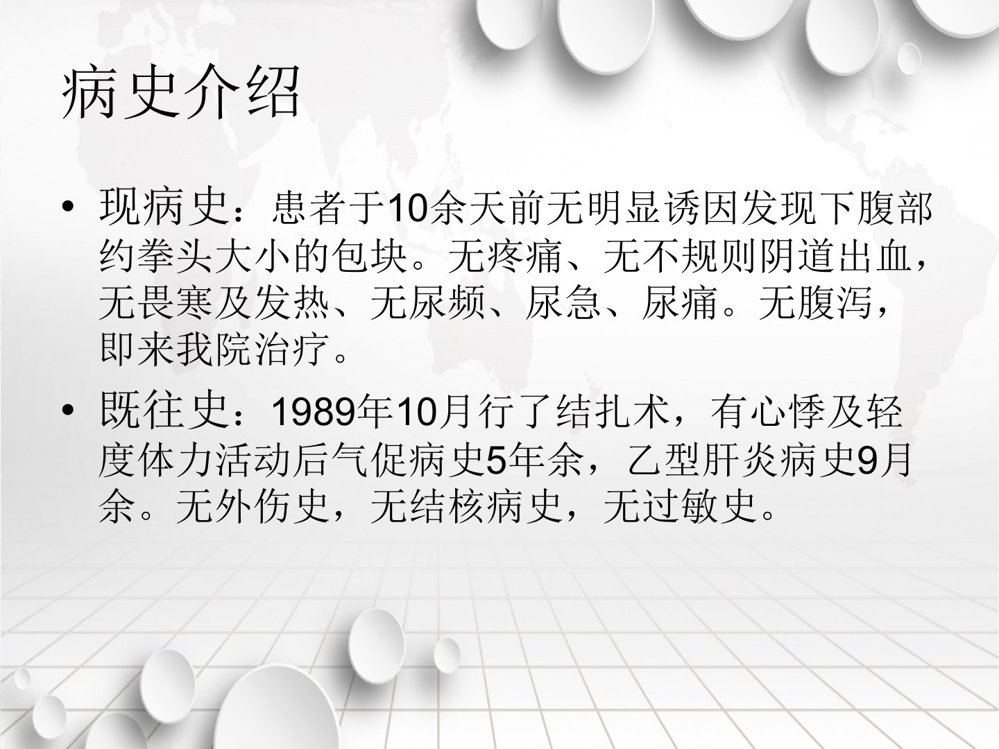 经腹子宫全切护理查房摘要患者因下腹部包块入院无疼痛等症状。既往有结扎术、心悸、乙肝病史。个人史无不良嗜好婚育史正常家族史无遗传病。专科检查示子宫体部肌瘤宫颈轻度糜烂及充血双侧附件无压痛。辅助检查B超示子宫肌瘤ECG示V4T波倒置血液检查正常乙肝表面抗原阳性。诊断为子宫肌瘤、心功能2级、乙型肝炎。术前准备包括建立护患关系、心理护理(讲解子宫功能、手术影响减轻焦虑)、饮食护理、阴道准备、肠道准备(腔镜用电刀禁用甘露醇)、皮肤准备、留置尿管、基础护理。手术顺利出血约800ML植入腹腔引流管、导尿管术后镇痛泵减轻疼痛。子宫肌瘤多见于3050岁妇女病因不明与雌、孕激素有关。分类根据部位和肌壁关系。临床表现包括月经改变、腹部肿块等。护理诊断涉及焦虑、活动无耐力、感染危险、知识缺乏、决策冲突、潜在并发症。护理措施包括心理、饮食、病情观察、手术前后护理、对症护理、预防感染、健康教育。