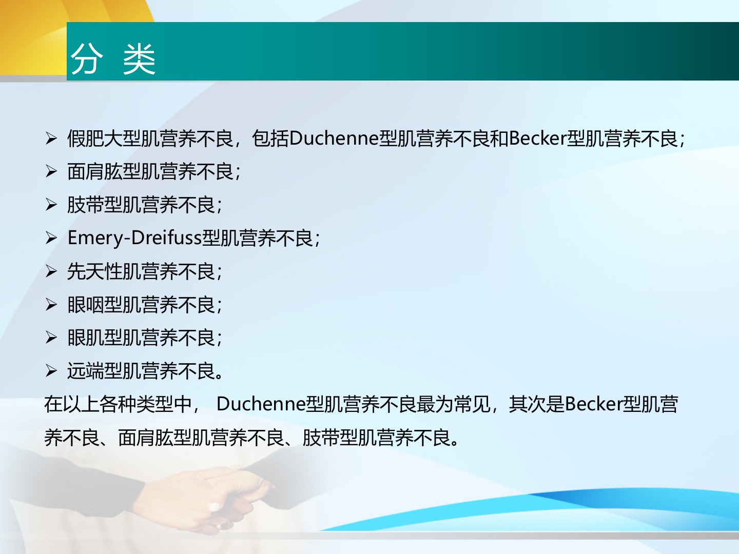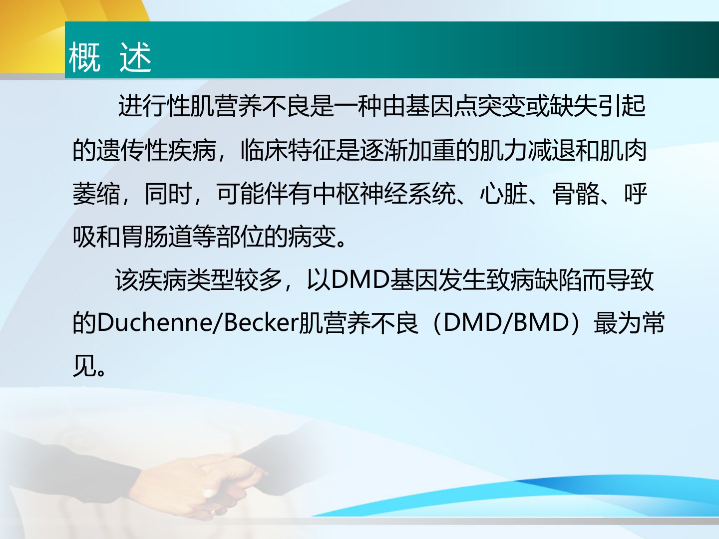 进行性肌营养不良症是基因缺陷导致的遗传性疾病以DuchenneBecker型最为常见。疾病特征为肌力减退、肌肉萎缩并可能伴有中枢神经系统、心脏、骨骼等多部位病变。其病因是相关基因缺陷导致蛋白结构改变影响功能造成肌肉破坏。该疾病病理主要表现为肌肉萎缩和无力可引发摔跤等症状严重者会因心力衰竭或呼吸道衰竭死亡。不同类型肌营养不良症症状各异如Duchenne型35岁起病表现为肌肉无力、假性肥大等20岁左右可能死于呼吸或心力衰竭;Becker型起病较晚病情较轻。该病无特效治愈方法主要治疗包括药物、康复训练等。护理需关注躯体运动障碍、受伤危险、焦虑及营养失调等问题采取相应护理措施如生活护理、早期康复干预、防跌倒等以延长生存期提高生活质量。