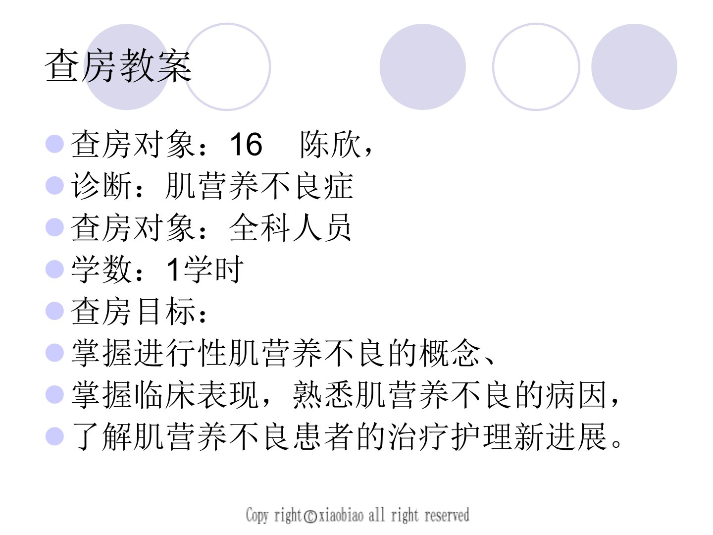 28病区徐伟红医生主持了进行性肌营养不良症护理查房查房对象为16床患者陈欣查房目标为掌握进行性肌营养不良的概念、临床表现熟悉病因了解治疗护理新进展。患者陈欣21岁因进行性四肢无力16年咳嗽、胸闷10余天就诊确诊为肌营养不良症。转入时患者四肢肌肉萎缩仅手指及足趾关节能动躯干肌肉萎缩不能翻身现呼吸平稳需辅助吸痰排痰。查房讨论了气管切开病人的气道管理包括保持室内空气清新、防止套管脱出、取合适卧位、定期做痰培养、观察并发症、保持呼吸道湿润通畅、根据痰液选择吸痰时机、每日更换敷料和清洁气管内套管、鼓励病人进食并做好口腔护理、备好急救设备等。患者存在躯体活动障碍、皮肤完整性受损危险、生活自理缺陷、清理呼吸道无效、语言沟通障碍等问题。进行性肌营养不良症是一组遗传性肌肉变性病临床以缓慢进行性加重的对称性肌无力和肌萎缩为特征。根据遗传方式、发病年龄等可分为不同类型大多有家族史。病因及发病机制复杂遗传因素起主导作用。目前尚无特效治疗以一般支持疗法为主。主要预防措施包括检出携带者和产前检查。