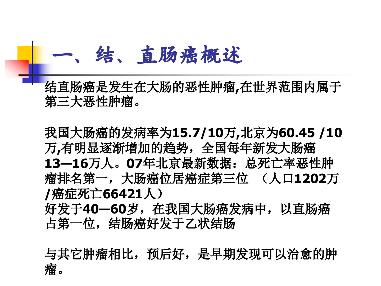 一、结、直肠癌概述结直肠癌是发生在大肠的恶性肿瘤,在世界范围内属于第三大恶性肿瘤。我国大肠癌的发病率为15.7/10万,北京为60.45/10万,有明显逐渐增加的趋势,全国每年新发大肠癌13—16万人。07年北京最新数据:总死亡率恶性肿瘤排名第一,大肠癌位居癌症第三位(人口1202万/癌症死亡66421人)好发于40—60岁,在我国大肠癌发病中,以直肠癌占第一位,结肠癌好发于乙状结肠与其它肿瘤相比,预后好,是早期发现可以治愈的肿瘤。结肠的生理功能◆吸收水份及部分电解质和葡萄糖(吸收部位:结肠上段)为食物残渣提供暂时储存和转运场所结肠粘膜分泌碱性粘液以保护粘膜和润滑粪便参与维生素K、维生素B复合...