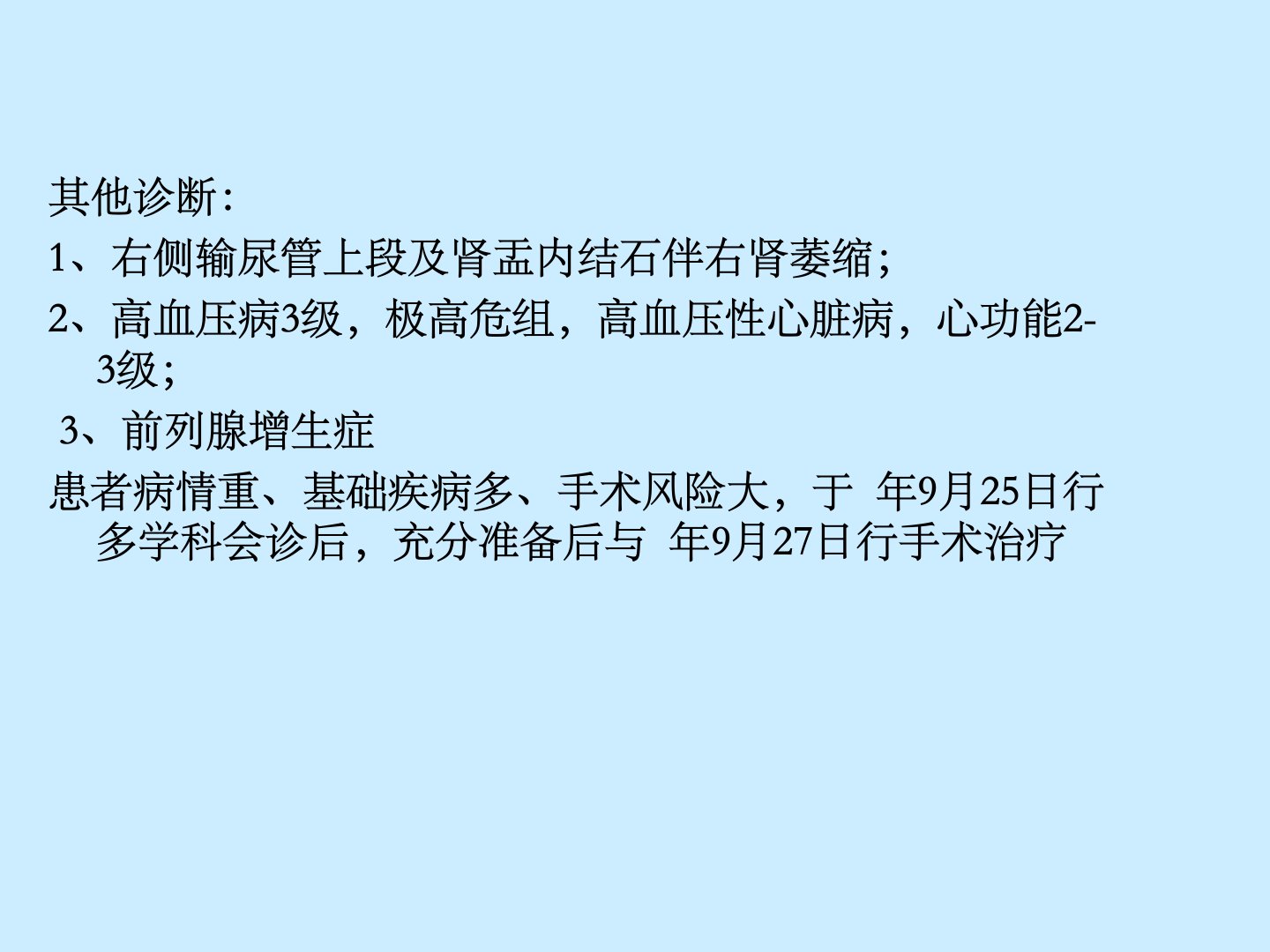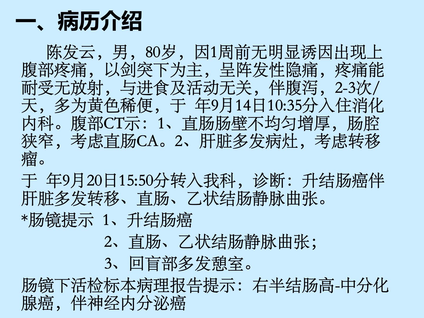 结肠癌的护理查房文档ppt一、病历介绍陈发云,男,80岁,因1周前无明显诱因出现上腹部疼痛,以剑突下为主,呈阵发性隐痛,疼痛能耐受无放射,与进食及活动无关,伴腹泻,2-3次/天,多为黄色稀便,于年9月14日10:35分入住消化内科。腹部CT示:1、直肠肠壁不均匀增厚,肠腔狭窄,考虑直肠CA。2、肝脏多发病灶,考虑转移瘤。于年9月20日15:50分转入我科,诊断:升结肠癌伴肝脏多发转移、直肠、乙状结肠静脉曲张。*肠镜提示1、升结肠癌2、直肠、乙状结肠静脉曲张;3、回盲部多发憩室。肠镜下活检标本病理报告提示:右半结肠高-中分化腺癌,伴神经内分泌癌其他诊断:1、右侧输尿管上段及肾盂内结石伴右肾萎缩;...
