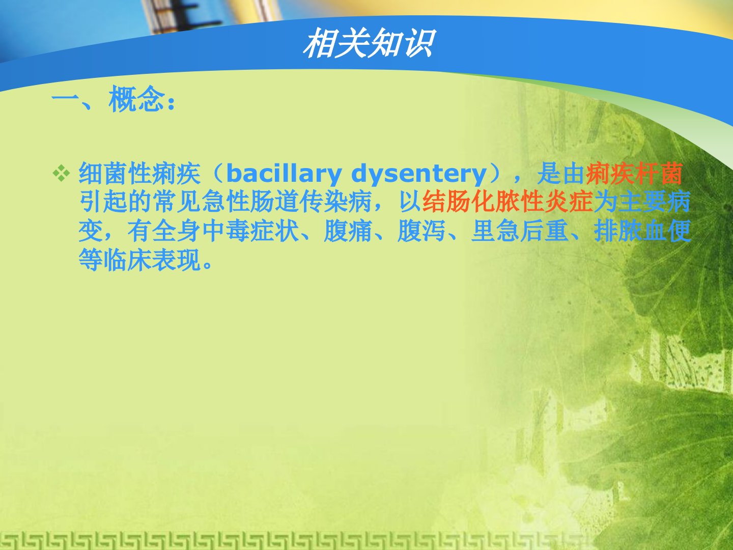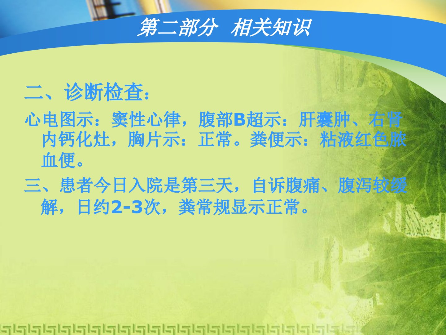 患者因“腹痛腹泻乏力2天”入院T:364神情精神欠佳自诉泻脓血便量多、日810次伴乏力头晕饮食可小便量少。诊断为细菌性痢疾此病由痢疾杆菌引起以结肠化脓性炎症为主要病变有全身中毒、腹痛、腹泻等症状。心电图示窦性心律腹部B超示肝囊肿、右肾内钙化灶胸片正常粪便为粘液红色脓血便。患者入院第三天腹痛、腹泻缓解日23次粪常规正常。治疗上予以抗炎降温止惊防治脑水肿和呼吸衰竭等可用冷温盐水低压灌肠应隔离至症状消失后一周或两次粪便培养阴性。护理包括对症护理、病情观察、心理护理及健康指导向病人及家属说明休息、饮食、饮水意义告知坚持服药争取急性期彻底治愈介绍家庭隔离措施并给予用药指导。同时改善个人和环境卫生防蝇灭蝇灭蟑螂流行期间可口服多价痢疾减毒活菌苗等预防。