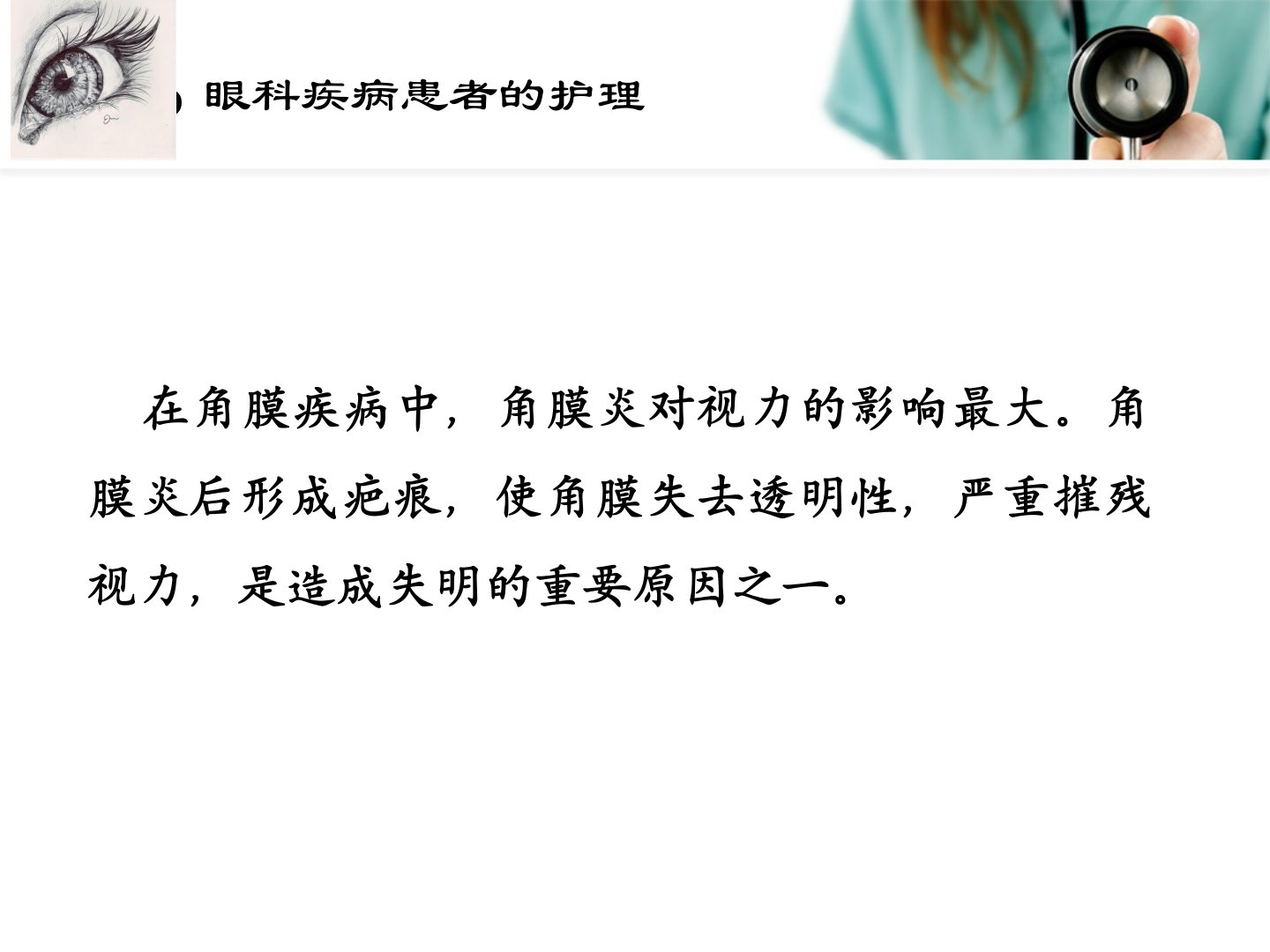 角膜炎患者护理摘要角膜炎对视力影响大是致盲重要原因。其特点包括发病率高、病程长、角膜刺激症状重这与角膜的组织学和解剖特点相关:角膜位于眼球前表面易受外伤和感染;是屈光介质重要部分炎症会使其混浊留下疤痕影响视力;角膜无血管营养靠角膜缘血管网及房水供应代谢功能低修复缓慢;角膜上有丰富三叉神经末梢炎症时刺激症状突出。角膜炎病因包括感染(最常见多在外伤后受病原微生物感染)、全身性疾病等可分为细菌性、真菌性、单纯疱疹性角膜炎。护理诊断有疼痛、视力障碍、潜在并发症、焦虑、知识缺乏。护理措施包括遵医嘱抗感染根据药物敏感试验选抗菌素;散瞳防粘连;预防穿孔如卧床休息、双眼涂眼膏加压包扎等;观察病情。