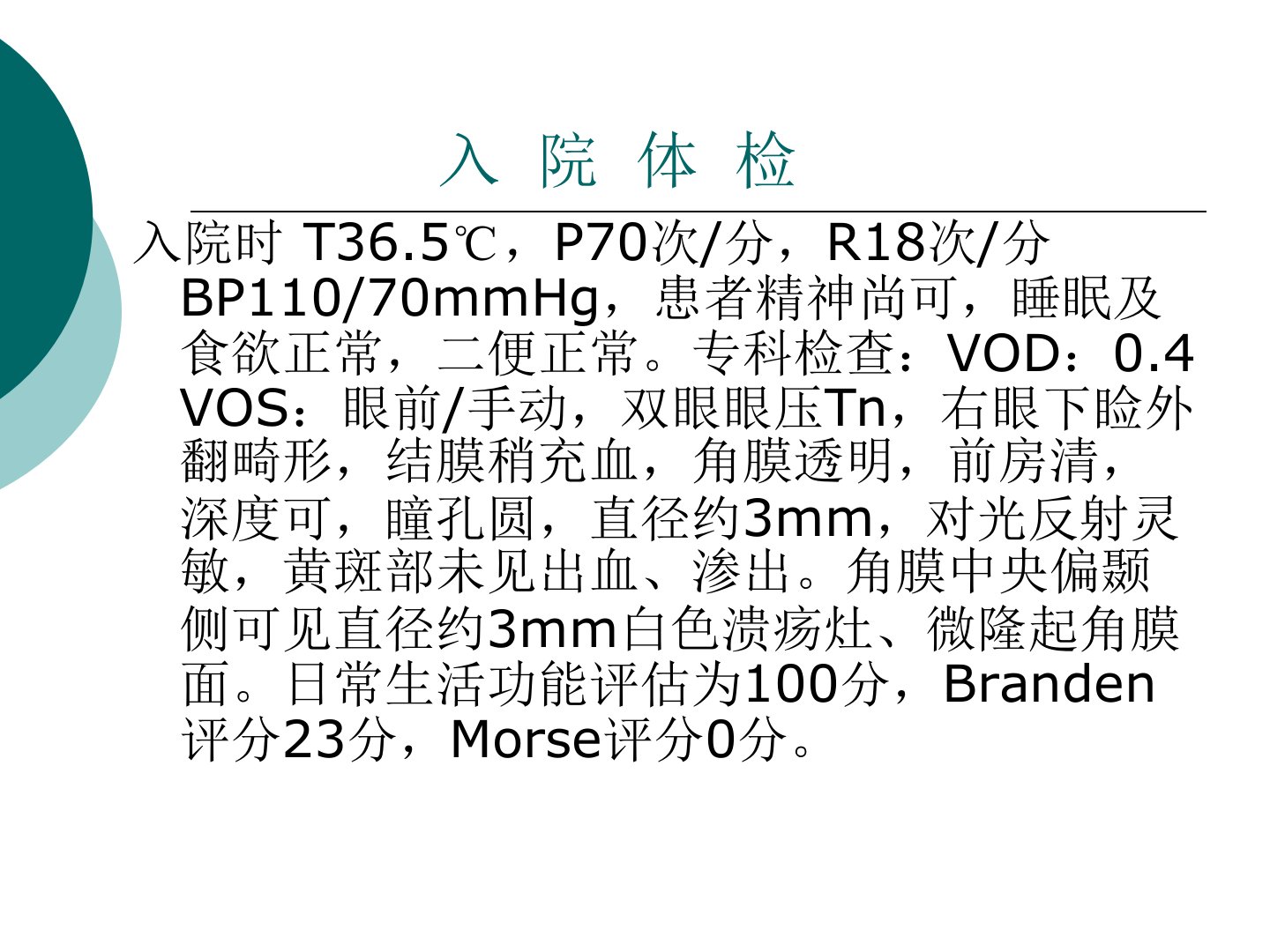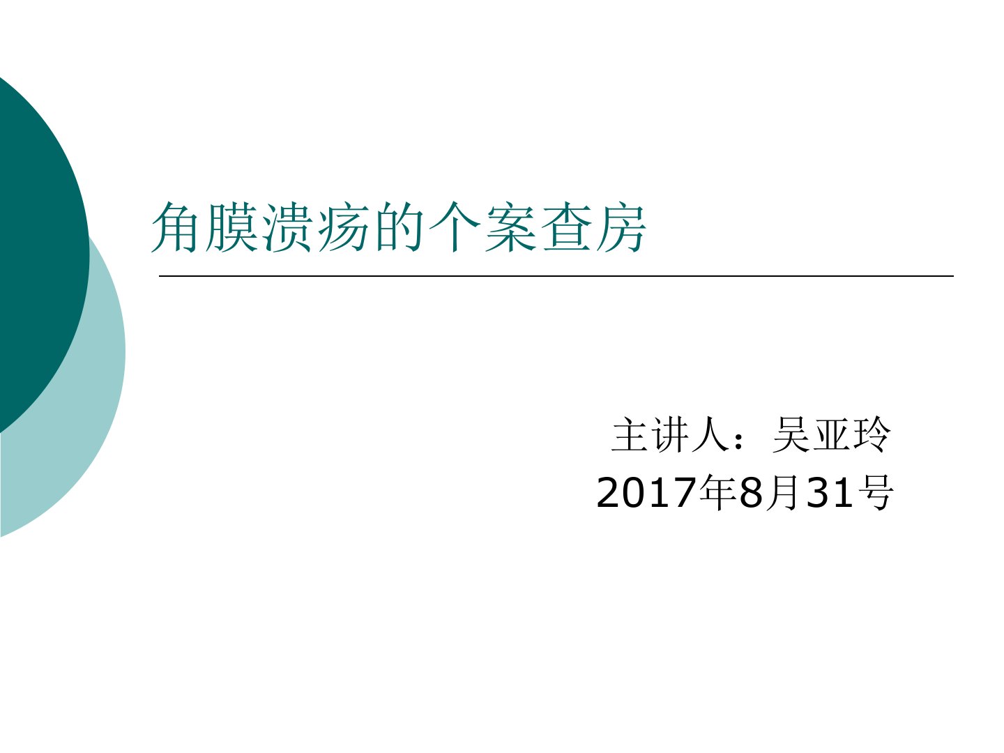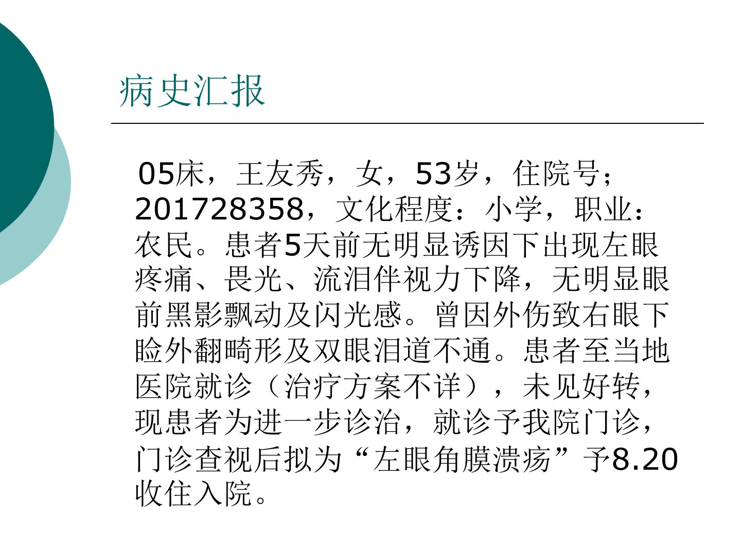 2017年8月31日吴亚玲医生主讲角膜溃疡个案查房患者王友秀53岁农民因左眼疼痛、畏光、流泪伴视力下降入院曾有外伤史当地医院治疗未见好转现拟“左眼角膜溃疡”收住入院。入院后给予抗感染、抗真菌、散瞳、营养角膜等对症治疗患者症状好转左眼视力有所恢复白色溃疡灶减小。查房时进行了护理评估及查体评定患者日常生活功能评估为100分Branden评分23分Morse跌倒坠床风险评估评分为0分。现存护理诊断包括疼痛、知识缺乏、潜在并发症(角膜穿孔)和焦虑并制定了相应护理措施。同时介绍了角膜溃疡的病理生理、临床表现、分类、并发症及治疗方法强调了角膜炎护理措施的重要性包括局部用药护理、保持结膜囊清洁等。最后给出了角膜炎的预防和健康教育建议以及患者出院后的定期复查、正确用眼药和生活规律等指导。