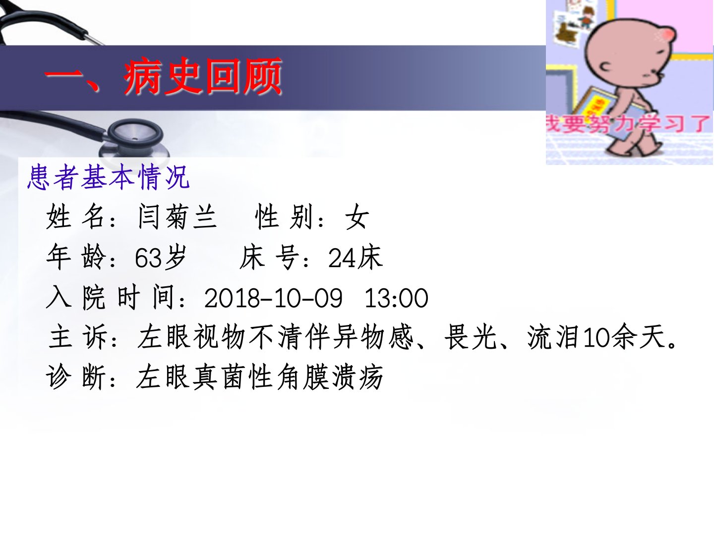 眼科角膜溃疡护理查房内容提要一、病史回顾患者基本情况姓名:闫菊兰性别:女年龄:63岁床号:24床入院时间:2018-10-0913:00主诉:左眼视物不清伴异物感、畏光、流泪10余天。诊断:左眼真菌性角膜溃疡病史回顾现病史患者自诉于入院前10余天无明显诱因出现左眼视物不清伴畏光、流泪、异物感等症,无视物变形、复视、视野缩小,无头痛、头晕、恶心、呕吐、抽搐等症。遂至当地诊所就诊,给予药物及滴眼液(具体药物不详)治疗后症状有所缓解。此后患者上述症状反复发作并渐进性加重,逐渐出现疼痛症状,睁眼困难,遂于今日来我院就诊,门诊诊断为"左眼真菌性角膜溃疡",建议住院治疗,为进一步诊治,我科以"左眼真菌性角...