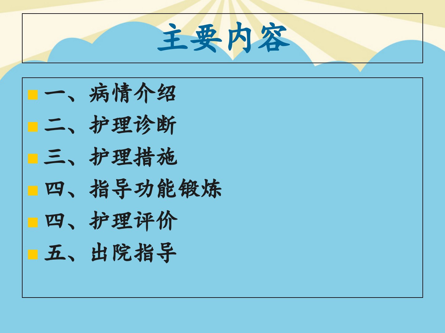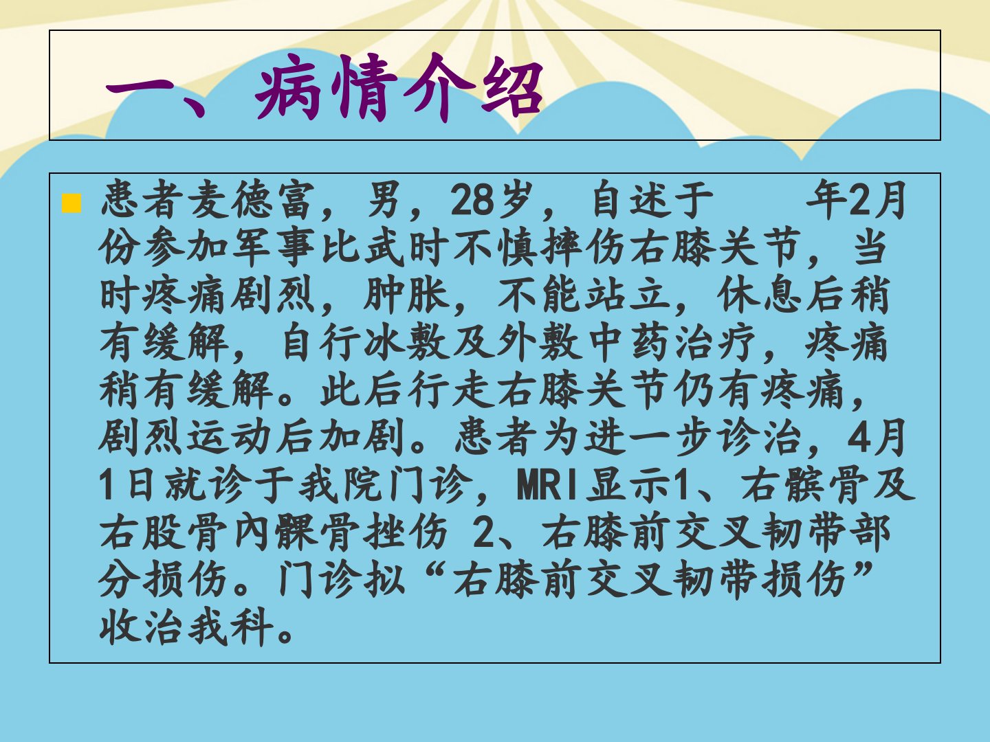 护理查房摘要患者麦德富28岁男性因军事比武摔伤右膝关节MRI显示右髌骨及右股骨內髁骨挫伤、右膝前交叉韧带部分损伤门诊收治入院。一、护理内容1护理诊断:包括疼痛、知识缺乏、躯体运动障碍、周围神经损伤、血管功能障碍、皮肤受损风险及潜在并发症等。2护理措施:术前:做好心理护理缓解患者焦虑;配合完成检查告知手术时间;完成术前准备禁食禁水指导床上大小便;指导功能锻炼预防感染做好皮肤准备。术后:常规护理监测生命体征抬高患肢冰敷膝关节;观察患肢及时处理疼痛、关节积血等情况;预防压疮协助翻身;预防并发症如肌肉萎缩、关节僵硬等。3功能锻炼:麻醉过后指导患者进行股四头肌等长收缩等锻炼。4护理评价:患者患肢灌注良好肿胀疼痛减轻无活动障碍并发症焦虑缓解掌握锻炼方法和康复知识。5出院指导:加强功能锻炼带活动型关节支具定期复查循序渐进恢复运动。