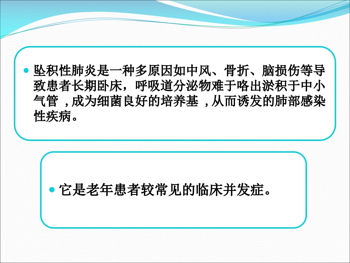 坠积性肺炎患者的护理摘要坠积性肺炎多因中风、骨折等导致患者长期卧床呼吸道分泌物淤积诱发是老年患者常见并发症严重影响预后。其致病菌多为条件致病菌对常用抗生素不敏感耐药性突出需高度重视防治。病因包括年龄因素致肺纤毛运动下降等;长期卧床致分泌物蓄积;呼吸肌麻痹加重肺底蓄积;呼吸道清除功能减弱;侵入性操作破坏屏障;全身性因素如昏迷等。诊断不难关键在早发现、早治疗。护理对策:体位引流床头摇高常变换体位;每23小时翻身1次每34小时拍背1次也可用振动排痰仪;吸痰时先吸气管内再吸口腔鼻腔严格无菌操作;湿化气道观察病情;清洁空气注意保暖;加强口咽部护理防误吸;运用非语言交流做好心理护理;开展健康教育告知患者勤翻身、拍背的重要性促进其康复。