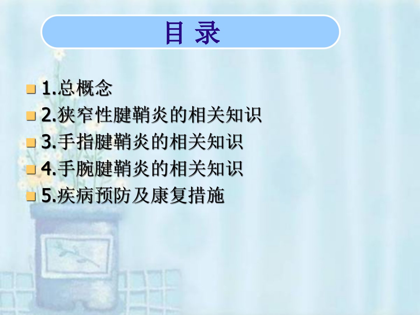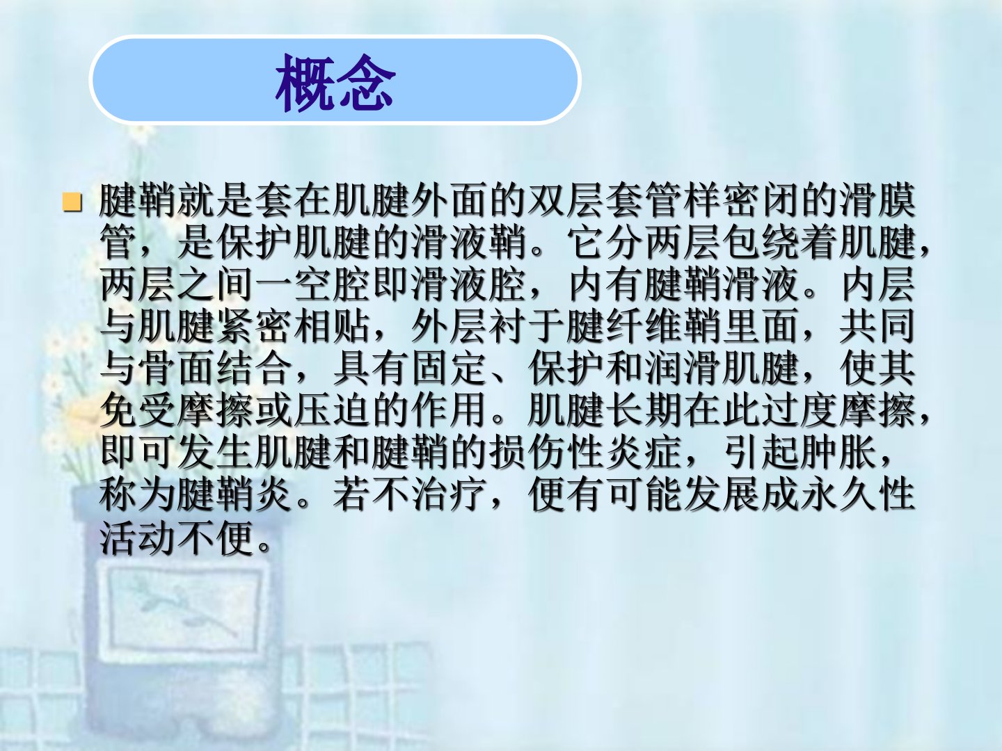 腱鞘炎护理查房摘要本文围绕腱鞘炎从多方面展开护理查房内容。首先介绍了腱鞘的概念其作为套在肌腱外的双层滑膜管对肌腱起固定、保护和润滑作用长期过度摩擦会引发腱鞘炎。接着文章阐述了狭窄性腱鞘炎相关知识包括其概念、病因、病理及临床表现。手指腱鞘炎常因过度活动或感染引发症状有红肿、疼痛等治疗方式多样。手腕腱鞘炎好发于办公族等病因主要是过度劳累症状包括疼痛、水肿等。在预防方面工作时要注意保持正确姿势避免关节过度劳损定时休息。对于长期伏案办公人员要采用正确工作姿势还可通过手腕旋转等动作缓解手部酸痛。康复措施包括热疗、按摩、局部封闭治疗等无效或反复发作时可考虑手术治疗。