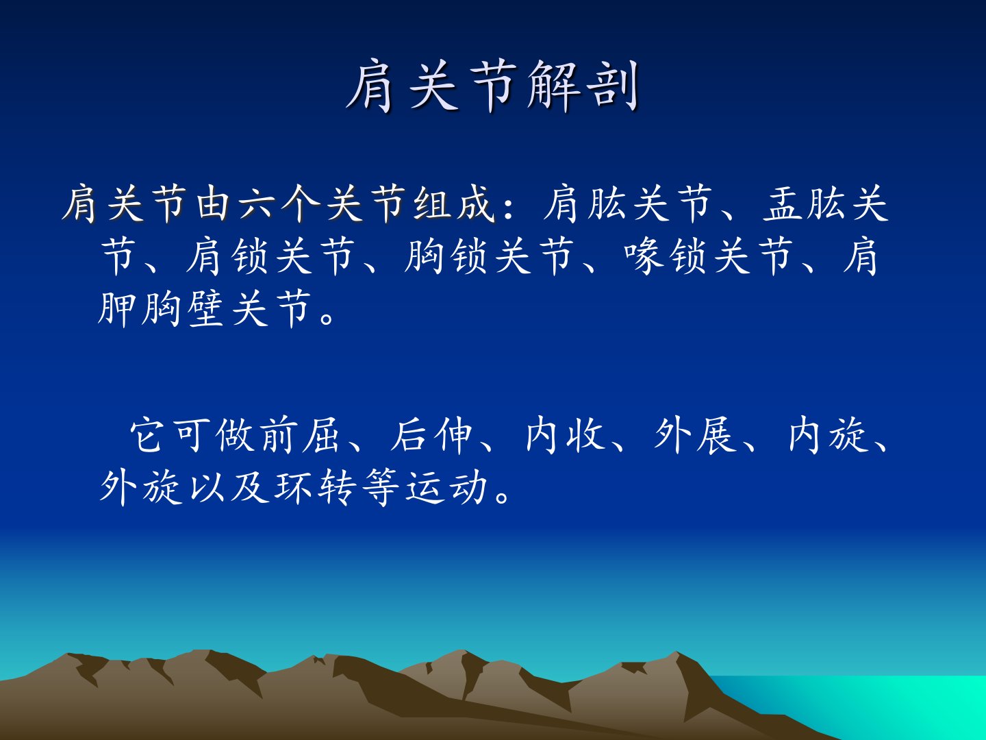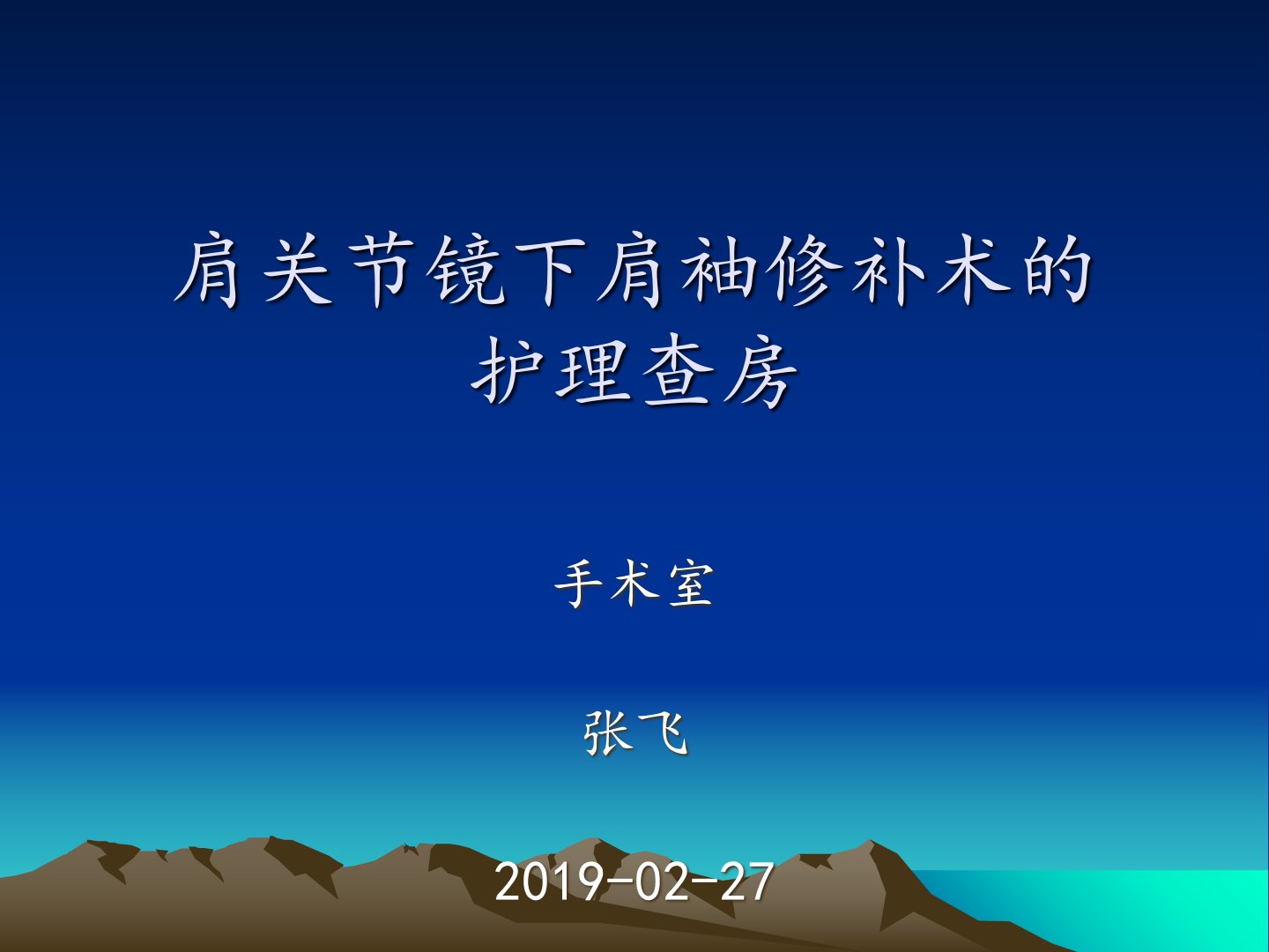 肩关节镜下肩袖修补术护理查房摘要本文是手术室张飞2019年2月27日关于肩关节镜下肩袖修补术的护理查房记录。肩关节由六个关节组成可进行多方向运动。肩袖由冈上肌、冈下肌、小圆肌和肩胛下肌的腱性组织构成对肩关节运动起支撑、稳定作用。肩袖损伤常见于体操、投掷等运动多因肩关节反复旋转或超常范围运动引起表现为肩部疼痛、压痛、功能障碍、肌肉萎缩等症状。病例介绍患者游金凤女55岁行肩峰成形术和肩袖修补术采用气管插管全身麻醉手术体位为侧卧位或沙滩卧位。手术步骤包括常规消毒铺单、选择手术入路、置入关节镜、腔内检查及治疗、切除病变组织、缝合肩袖等。巡回护士需注意建立静脉通路、安置体位、安放仪器、观察患者生命体征等。器械护士需提前准备并检查器械确保无菌操作配合手术步骤传递器械。手术体会强调无菌要求高、关节镜器械贵重需专人保管、保持术中视野清晰、防止灌洗液外露污染、共同清点手术用物、灌洗液中加入肾上腺素减少渗血、牵引重量不能大于5Kg、做好器械清洁保养工作。侧卧位摆放需检查身体各部位、确保体位架稳固、做好保暖、避开敏感部位受压等。关节镜器械需专人管理定期保养消毒。