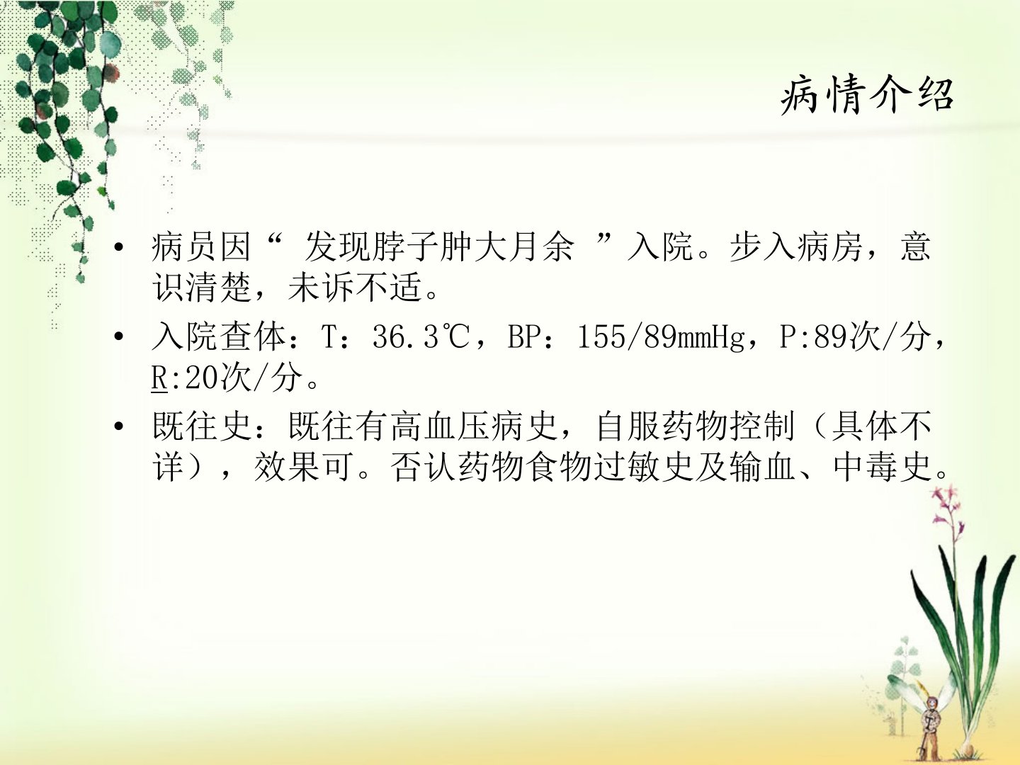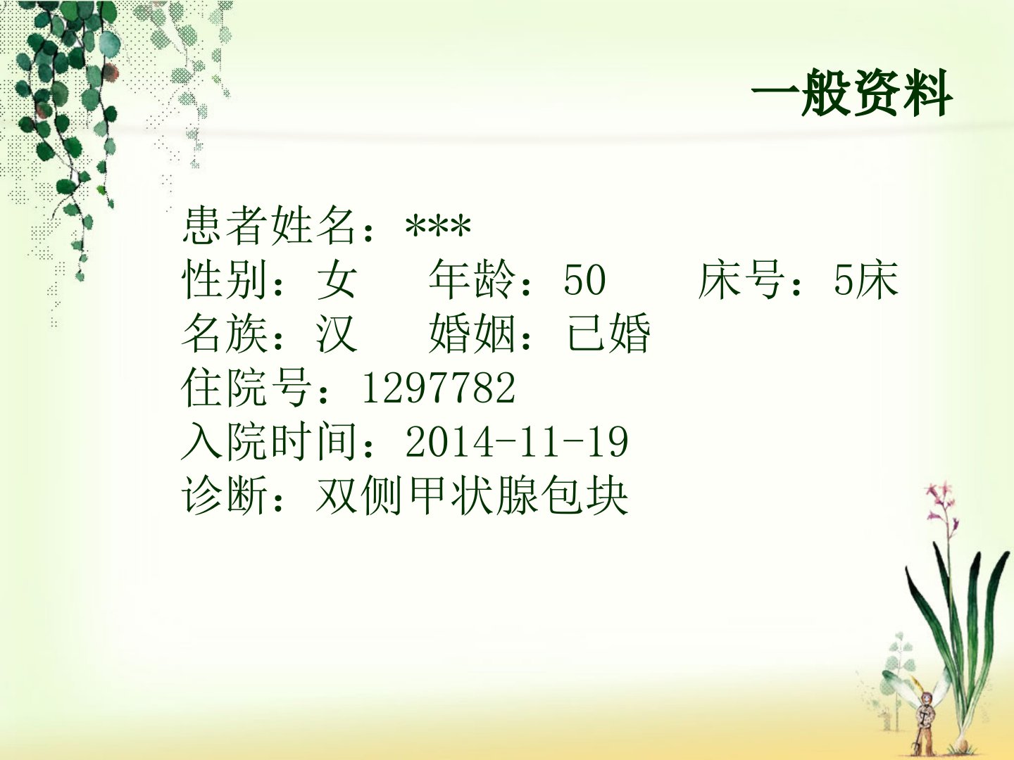 本文是关于一名50岁女性患者的甲状腺肿护理查房记录。患者因“发现脖子肿大月余”入院有高血压病史病因不明可能涉及遗传、放射、免疫等多因素。病理显示甲状腺血管增多、扩张等。临床表现多为无意中发现一般无不适症状少数有压迫症状或甲亢症状。辅助检查包括B超、X线、心电图等。护理问题涉及自我形象紊乱、焦虑、受伤危险、清理呼吸道无效等。处理原则为尽早手术切除并做病理学检查。护理措施包括术前心理、体位、饮食护理控制血压术后保持呼吸道通畅、观察并发症、饮食营养等。护理评价显示病人术后恢复顺利未发生并发症。出院指导包括心理调适、功能锻炼和定期复查鼓励病人积极配合治疗促进颈部功能恢复并定期到门诊复查。