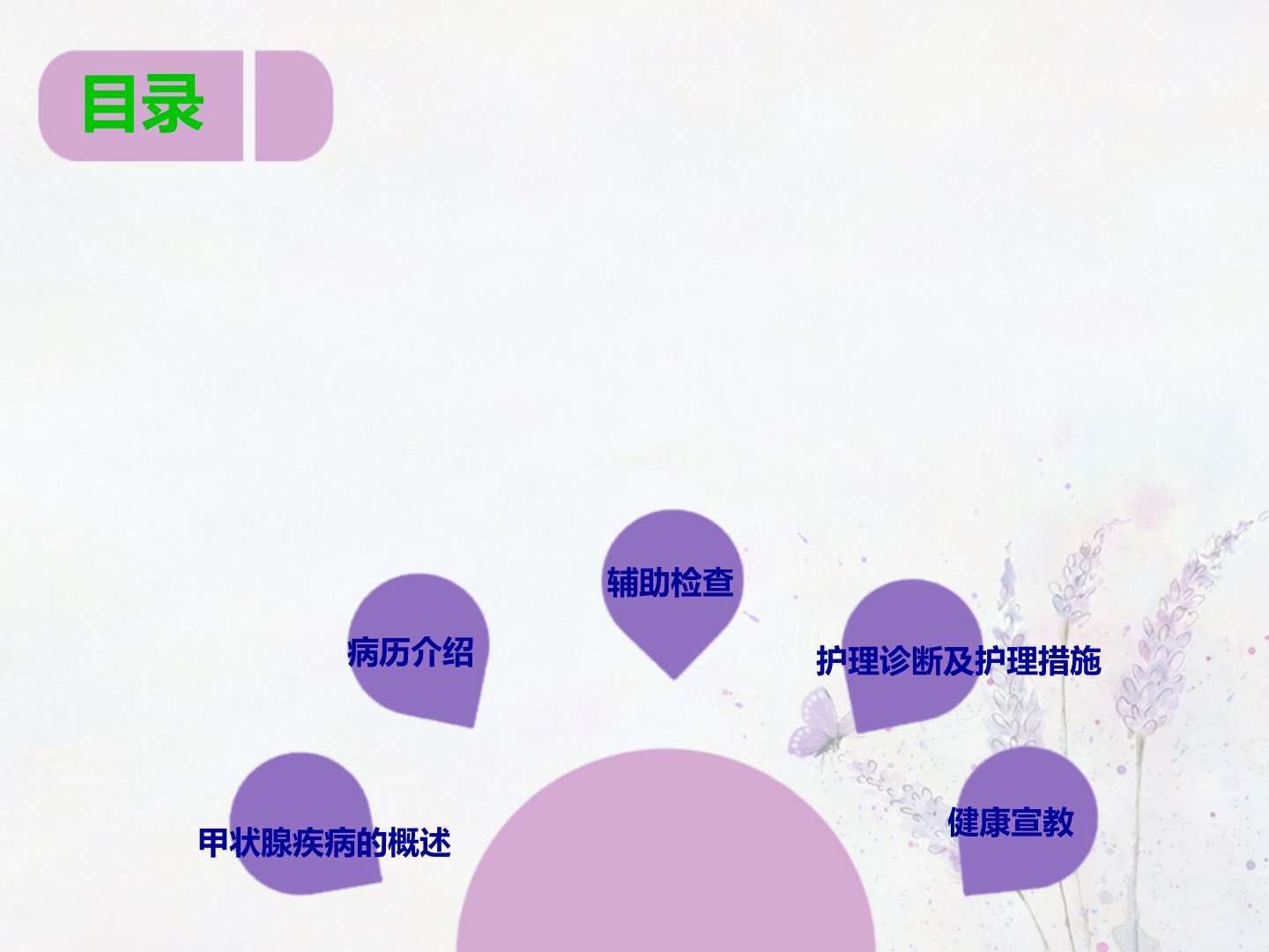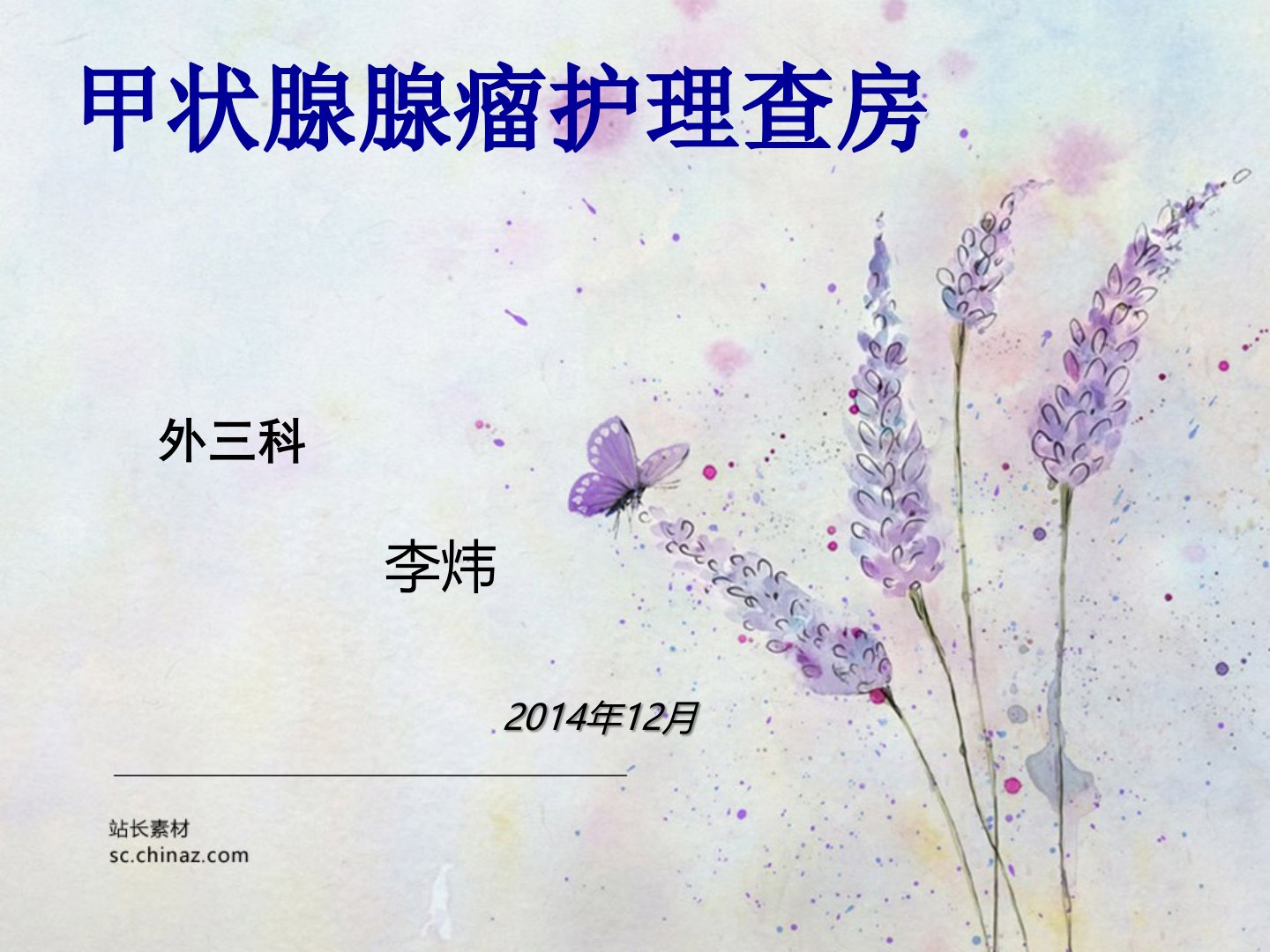 甲状腺腺瘤护理查房摘要2014年12月外三科李炜进行甲状腺腺瘤护理查房。甲状腺重约30克位于气管两旁功能是合成等甲状腺激素病因尚不明确可能与遗传、射线照射等因素有关。临床表现上初期多无明显症状随病情进展肿块增大、质硬晚期可产生声音嘶哑等症状。辅助检查包括B超、针吸涂片细胞学、CT检查等。病历中患者张某女70岁因右侧颈前区包块5天入院初步诊断为甲状腺腺瘤。治疗计划包括完善检查、择期手术、对症支持治疗等。术前护理包括心理护理、饮食护理、体位及皮肤护理。术后护理诊断有疼痛、清理呼吸道无效、潜在并发症等针对不同诊断采取相应护理措施如密切观察病人疼痛情况、鼓励病人有效咳嗽排痰、加强巡视观察伤口渗血情况等患者恢复良好。术后健康宣教包括饮食和出院指导。