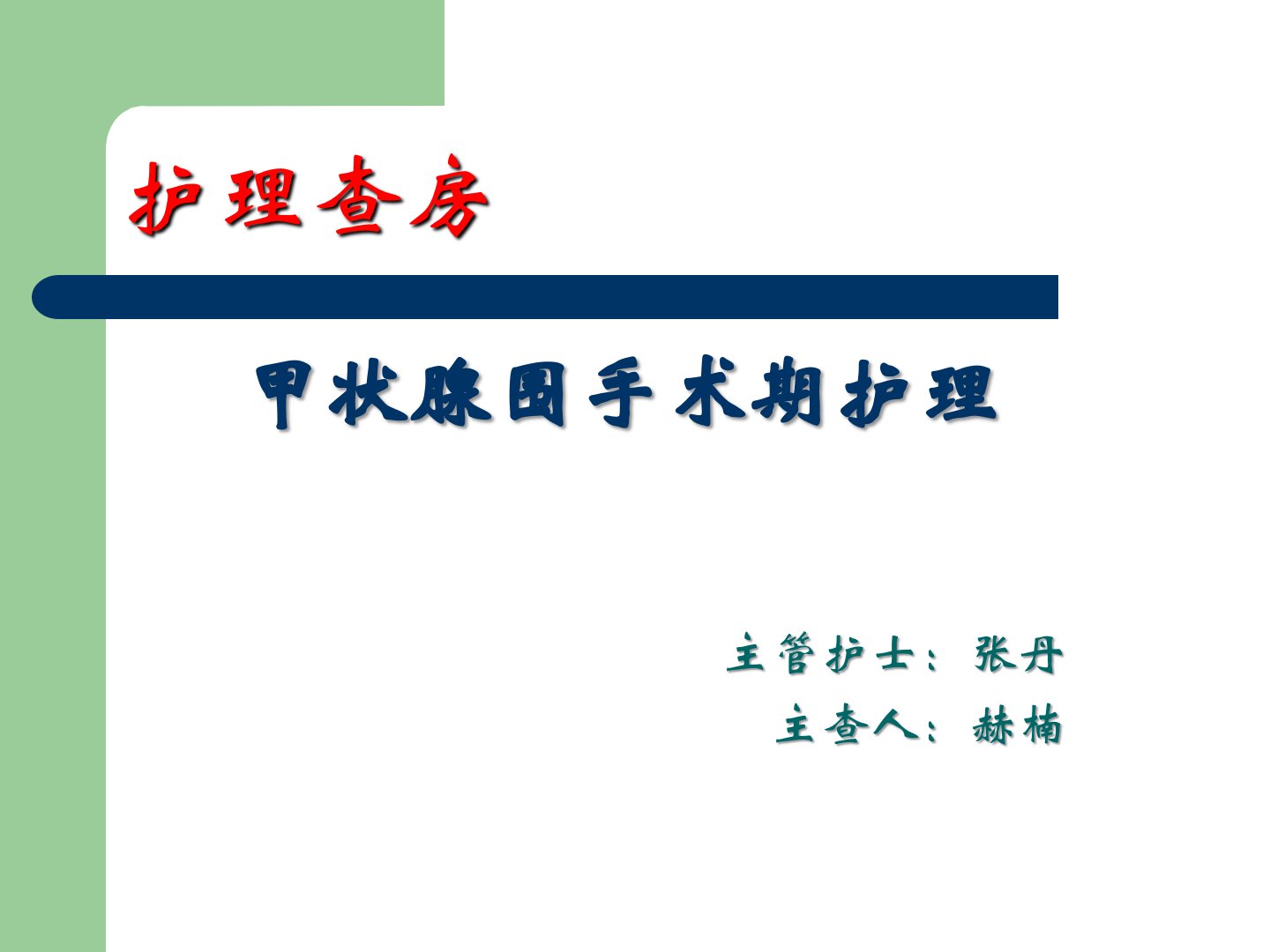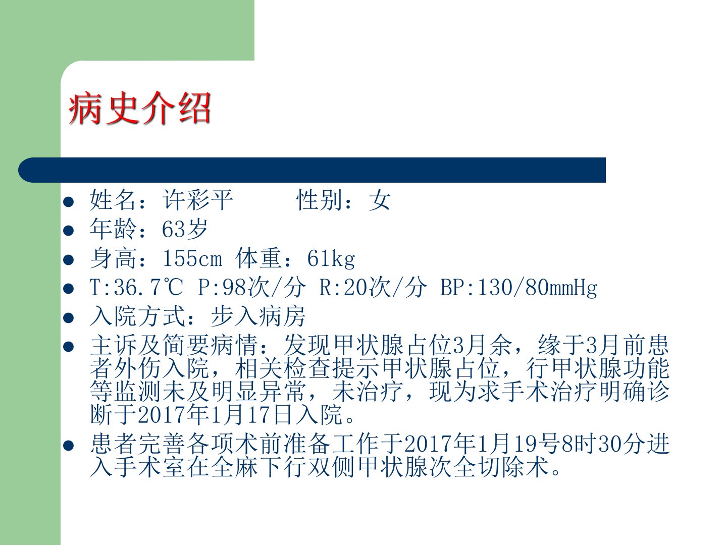 甲状腺围手术期护理主管护士:张丹主查人:赫楠护理查房目录一、听病史辅助检查护理问题二、查检查前的准备、一般状态的检查、体格检查、专科检查三、提问与分析定义、临床表现、病理分类、辅助检查、处理原则、健康教育病史介绍姓名:许彩平性别:女年龄:63岁身高:155cm体重:61kgT:36.7℃P:98次/分R:20次/分BP:130/80mmHg入院方式:步入病房主诉及简要病情:发现甲状腺占位3月余,缘于3月前患者外伤入院,相关检查提示甲状腺占位,行甲状腺功能等监测未及明显异常,未治疗,现为求手术治疗明确诊断于2017年1月17日入院。患者完善各项术前准备工作于2017年1月19号8时30分进入手术...