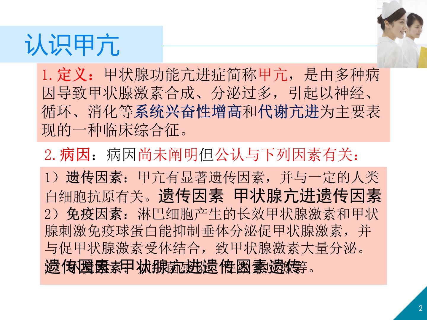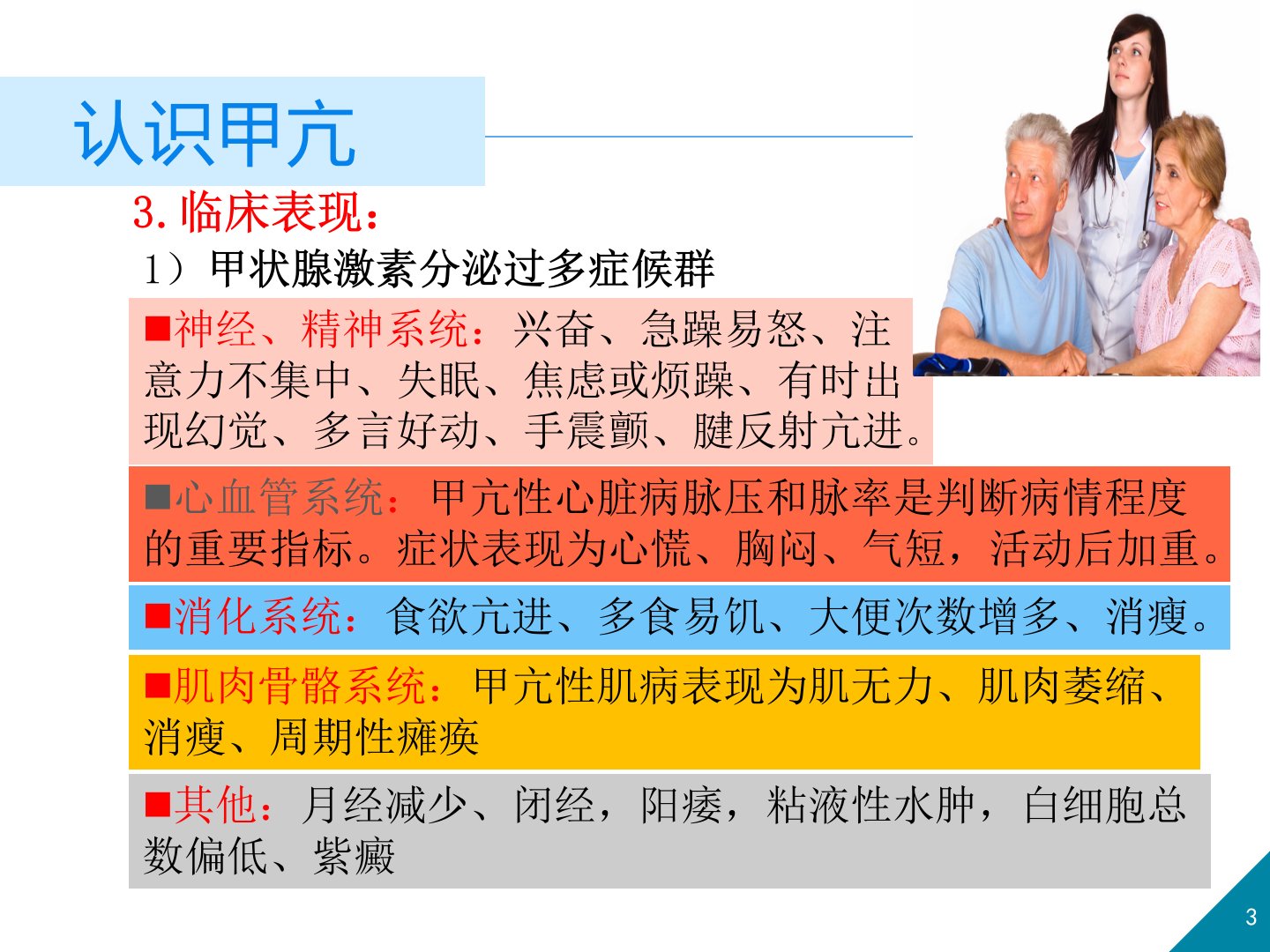 甲状腺功能亢进症健康教育摘要甲状腺功能亢进症(甲亢)是由多种病因导致甲状腺激素过多引起的临床综合征。病因包括遗传、免疫和环境因素。临床表现多样:甲状腺激素分泌过多可致神经、心血管、消化等多系统兴奋性增高出现心慌、消瘦、手震颤等症状;甲状腺多呈弥漫性、对称性肿大;部分患者有突眼征;严重时可致甲状腺危象。健康教育方面甲亢患者发病期间应适当卧床休息病情稳定后可适度活动甲亢合并心功能不全者避免剧烈运动。饮食上强调营养以低盐、高热量、高蛋白、高维生素为主少食多餐禁食高碘、刺激性食物戒烟酒。用药需遵医嘱定期复查。中药调养可宁心神、补肝肾、养阴津。心理上患者应调畅情志静心休养。131碘治疗利用射线作用适应症包括中度甲亢、药物过敏等治疗前后有特定饮食与休息要求。此外患者还应坚持自我监测树立已病早治、既病防变的中医养生观念。