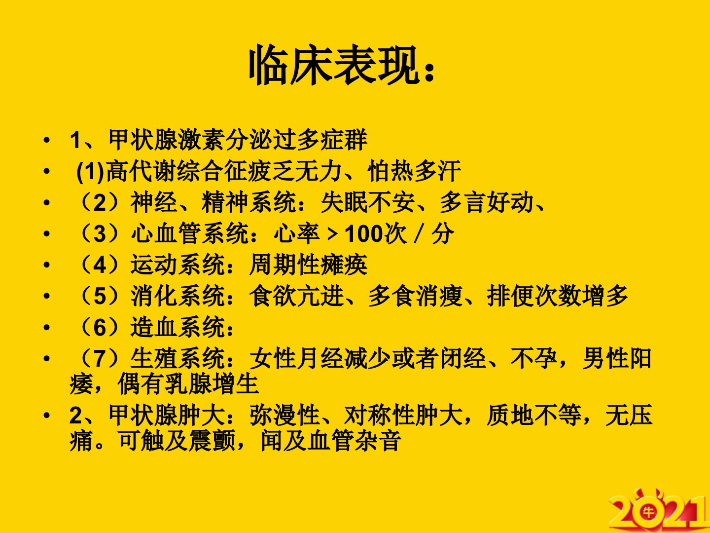 本次护理查房主题为甲状腺功能亢进患者龙冬芽女53岁有19年甲亢病史因咳嗽、咳痰、心悸、气促10余天入院。甲亢由多种病因致甲状腺激素分泌过多表现为神经、循环、消化等系统兴奋性增高及代谢亢进。患者有高代谢综合征、神经精神系统、心血管系统异常等症状还有甲状腺肿大、眼症等体征。辅助检查包括血清游离甲状腺素、总甲状腺激素等测定及影像学检查。治疗上采用抗甲状腺激素药物丙硫氧嘧啶、碘131治疗、手术及其他治疗。护理诊断有营养失调、活动无耐力、焦虑、自我形象紊乱、有受伤及感染危险、潜在并发症甲亢危象等。针对高热、营养失调、潜在并发症等问题采取了降温、补充营养、病情监测等护理措施经评价患者体温降至正常营养状况改善住院期间未发生甲状腺危象口腔溃疡好转活动耐力增强未发生跌倒。