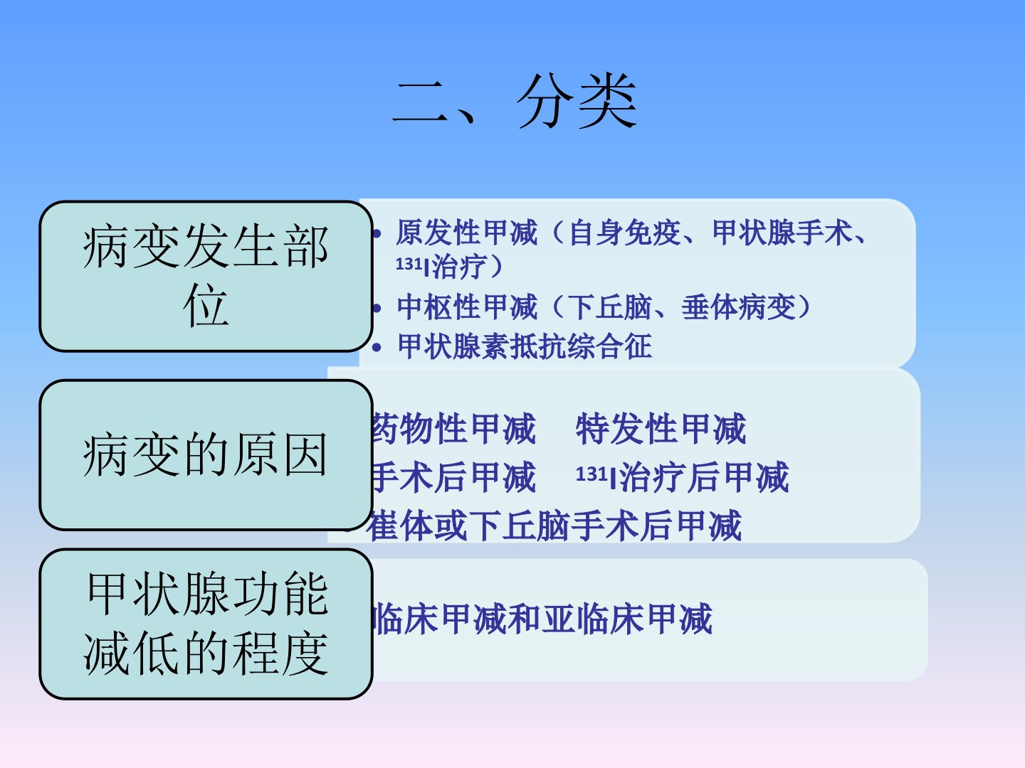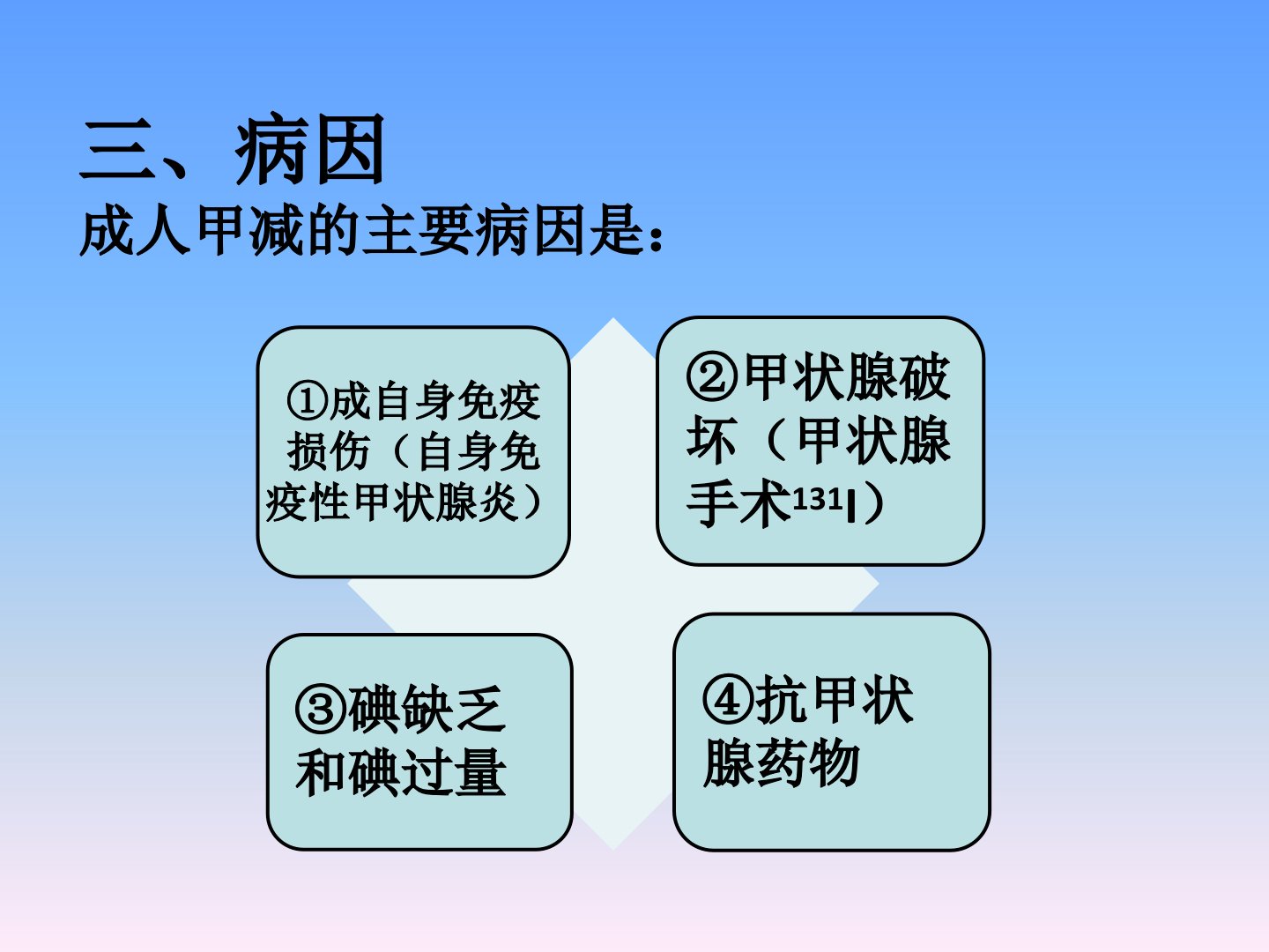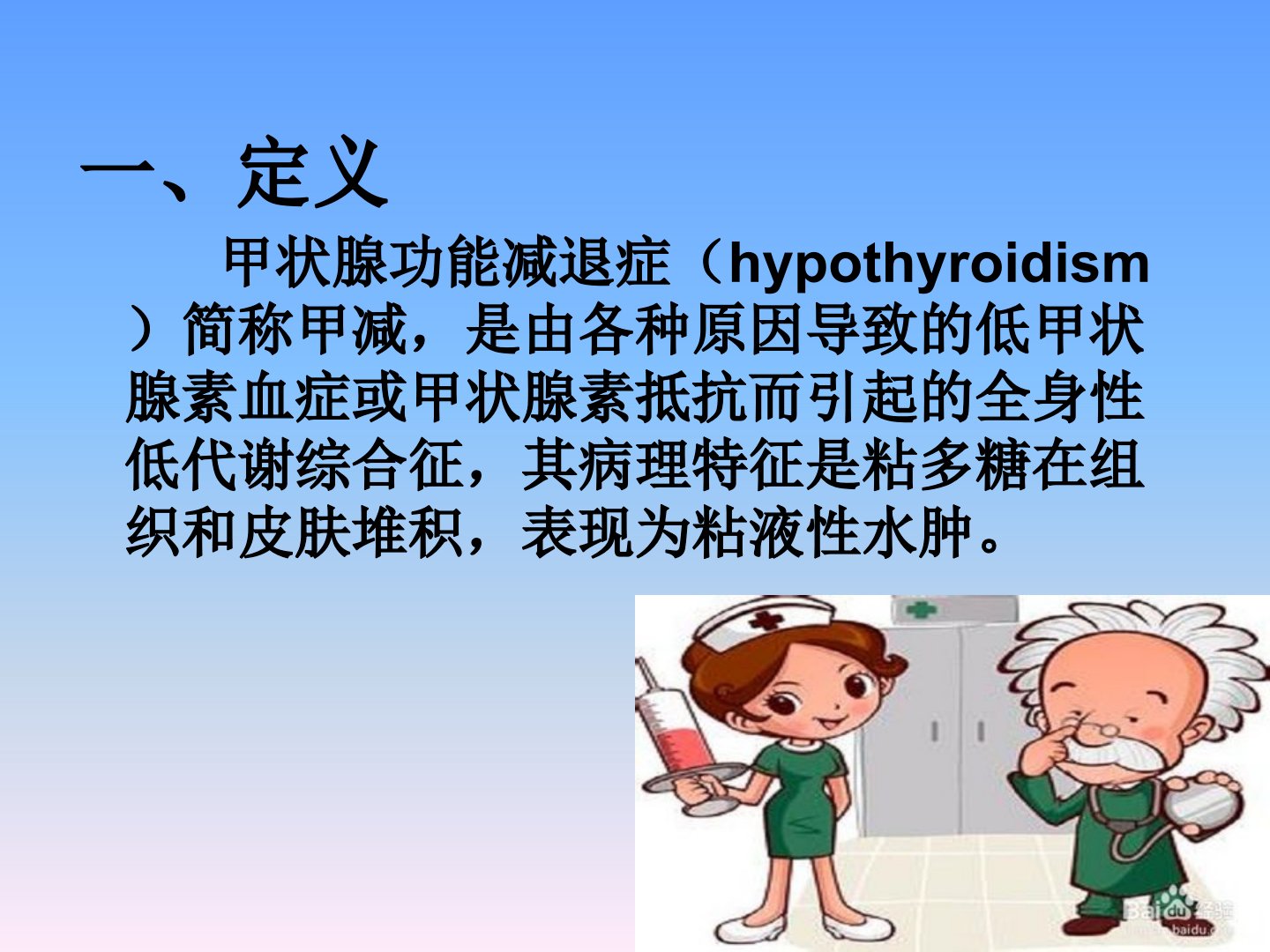 甲状腺功能减退症(甲减)是因低甲状腺素血症或甲状腺素抵抗引发的全身性低代谢综合征病理特征是粘多糖堆积致粘液性水肿。成人甲减病因多样症状以代谢率减低和交感神经兴奋性下降为主早期或无特异性症状典型者有畏寒、乏力、嗜睡等表现。辅助检查包括血清TSH、TT4、FT4等指标以及轻中度贫血、血清总胆固醇等相关检测。治疗需补充甲状腺素且终生服药治疗初期每46周复查激素水平。护理方面针对舒适度改变、活动无耐力、焦虑及潜在便秘等护理诊断制定相应护理措施如提供舒适环境、注意休息、注重保暖、引导病人缓解焦虑、养成定时排便习惯等。经护理患者症状缓解舒适度提高对疾病认识加深焦虑缓解住院期间未出现便秘。