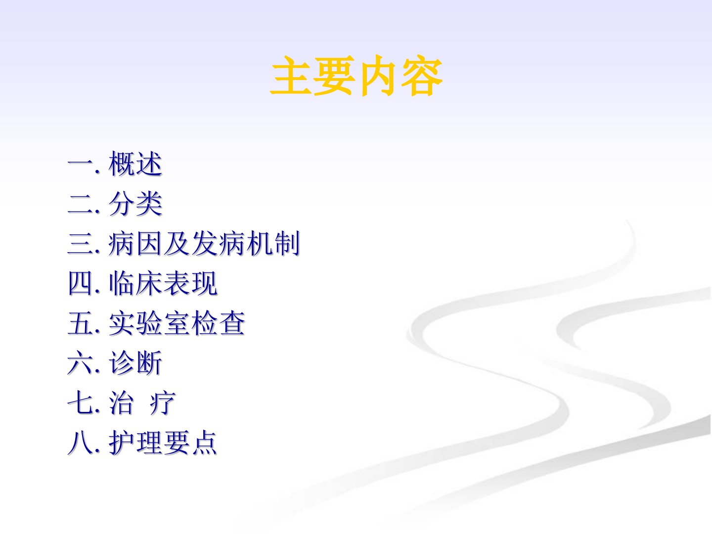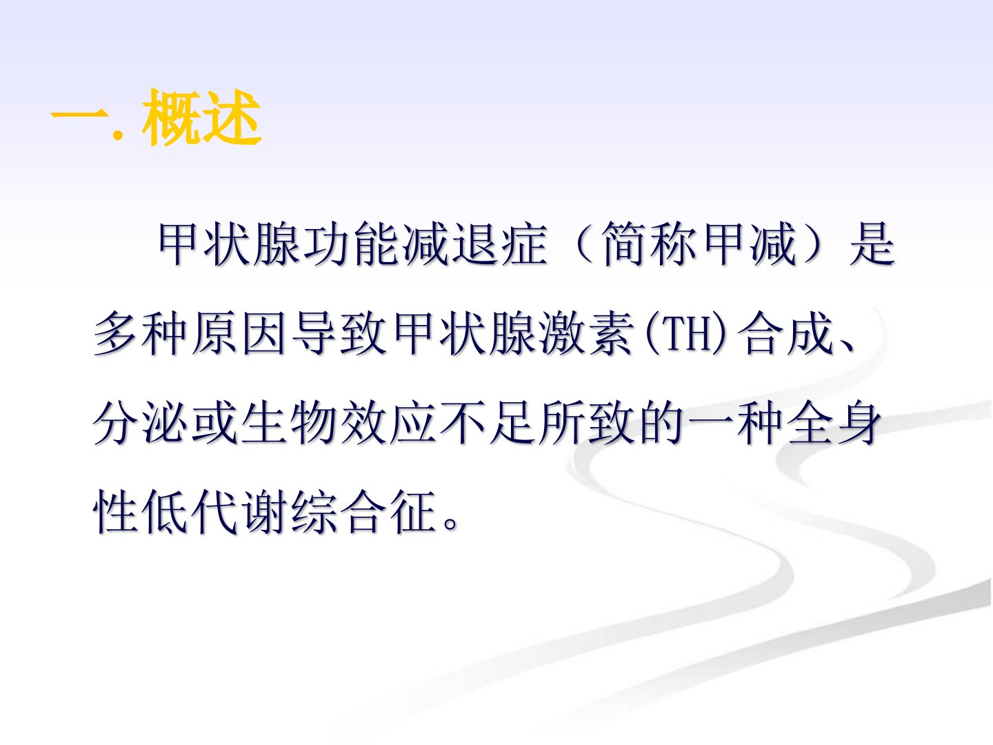 摘要甲状腺功能减退症(甲减)是因甲状腺激素合成、分泌或生物效应不足导致的全身性低代谢综合征。患病率普通人群为0810女性多于男性成年后随年龄增加患病率上升。分类:按病变部位分原发性、中枢性、外周组织生物效应障碍性甲减;按病因分药物性、手术后等多种类型;按程度分临床甲减、亚临床甲减;按年龄分呆小病、幼年型、成年型甲减。病因及发病机制:甲状腺性甲减主要因自身免疫损伤、甲状腺破坏等;中枢性甲减由垂体或下丘脑疾病引起;周围性甲减多为家族遗传性疾病。临床表现:发病隐匿有代谢率减低和交感神经兴奋性下降表现典型病人有粘液性水肿面容等。诊断:依据临床表现、实验室检查(血清TSH、FT4等)、病变部位诊断(TRH兴奋实验等)、病因诊断。治疗:病因预防及治疗均需TH替代首选左甲状腺素(LT4)粘液性水肿昏迷需特殊治疗。护理要点:评估患者情况保持环境安静、温度适宜注意休息与活动给予高蛋白等饮食做好基础、专科护理及心理护理出院做好饮食、用药等指导。