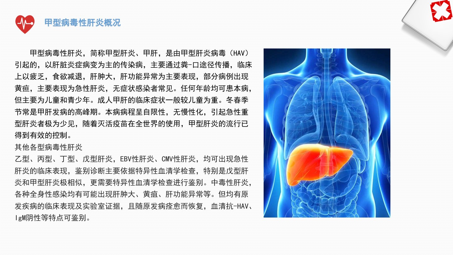 甲型病毒性肝炎的护理摘要甲型病毒性肝炎(甲肝)由甲型肝炎病毒(HAV)引起主要通过粪口途径传播以肝脏炎症病变为主疲乏、食欲减退、肝肿大、肝功能异常为主要表现部分病例出现黄疸多为急性肝炎无症状感染者也较常见冬春季节常为发病高峰期病程呈自限性极少引起急性重型肝炎灭活疫苗的使用已有效控制甲肝流行。传染源为甲肝患者和无症状感染者未注射疫苗者普遍易感患过甲肝可获持久免疫力。临床表现多样包括急性黄疸型、急性无黄疸型、瘀胆型、亚临床型、重型及暴发型。护理方面需按消化道或血液隔离观察病人皮肤等情况做好口腔清洁急性肝炎病人给予适当热量、清淡、可口饮食逐步增加活动量。预防措施包括养成良好卫生习惯、不吃未煮熟的食物、接种甲肝疫苗、对密切接触者注射丙种球蛋白、食源性感染检查厨师并隔离治疗、发现甲肝病人及时报告等。