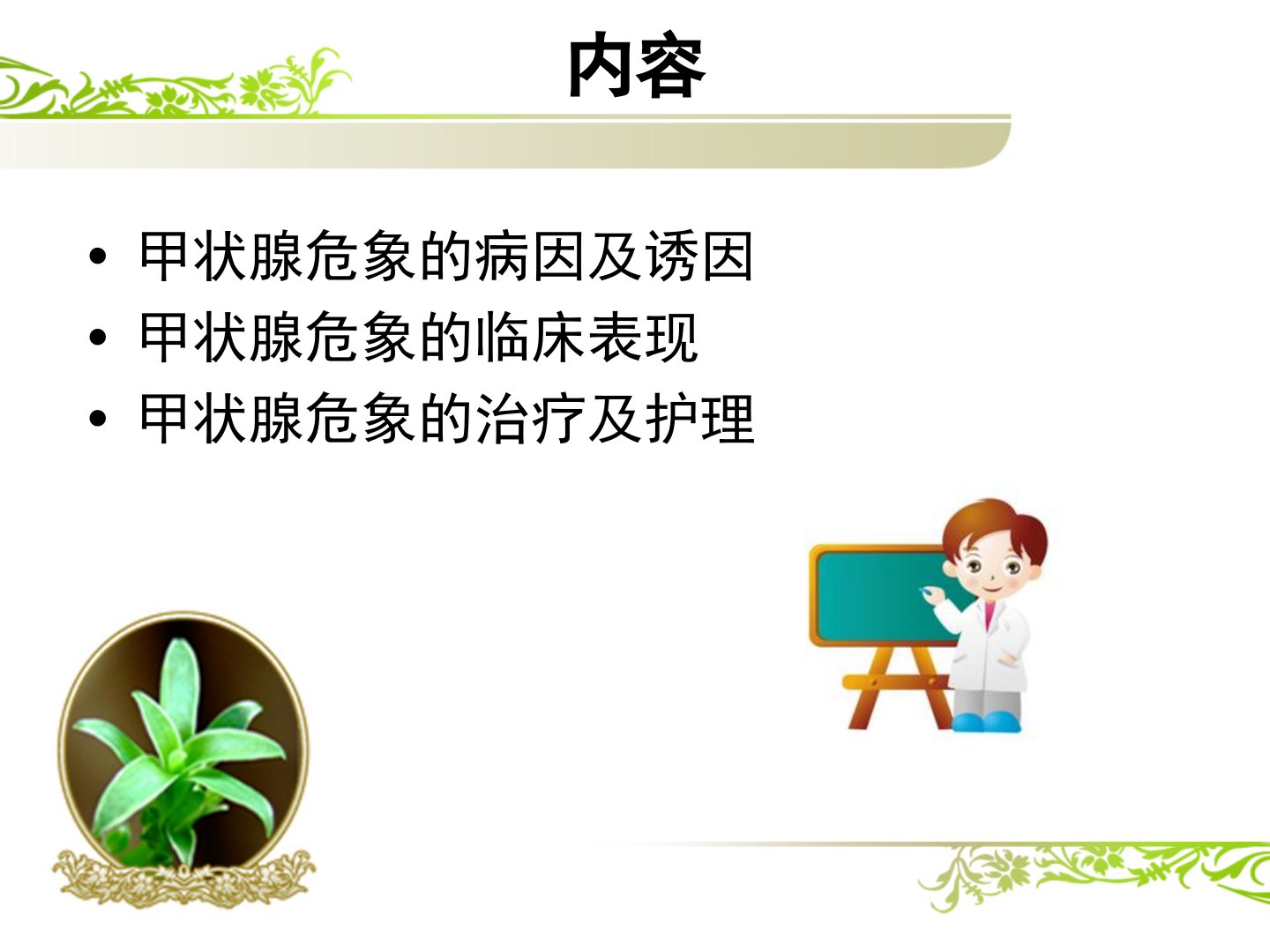 甲亢危象指多种原因致甲状腺激素过多引发高代谢临床综合征以弥漫性甲状腺肿伴甲亢最常见。病因上内科诱因如感染、应激等较外科诱因病情严重。发病机理方面危象先兆表现为原有甲亢症状加重并伴发热、乏力、多汗等症状。活跃型危象典型表现为高热、大汗淋漓、心动过速等;淡漠型危象少见症状体征不明显。治疗上应抑制甲状腺素合成首选丙基硫氧嘧啶等配合阻止甲状腺素释放、降低周围组织反应、肾上腺糖皮质激素等治疗同时对症支持治疗。护理时要避免诱因监测病情警惕危象发生;紧急处理时需绝对卧床休息给氧、建静脉通道、按医嘱给药;用药遵医嘱观察疗效及副作用;对症护理如处理体温过高、躁动等;健康教育方面要避免刺激、保持身心愉快合理饮食宣传护眼方法自我观察症状不任意间断、更改药物剂量或停药。