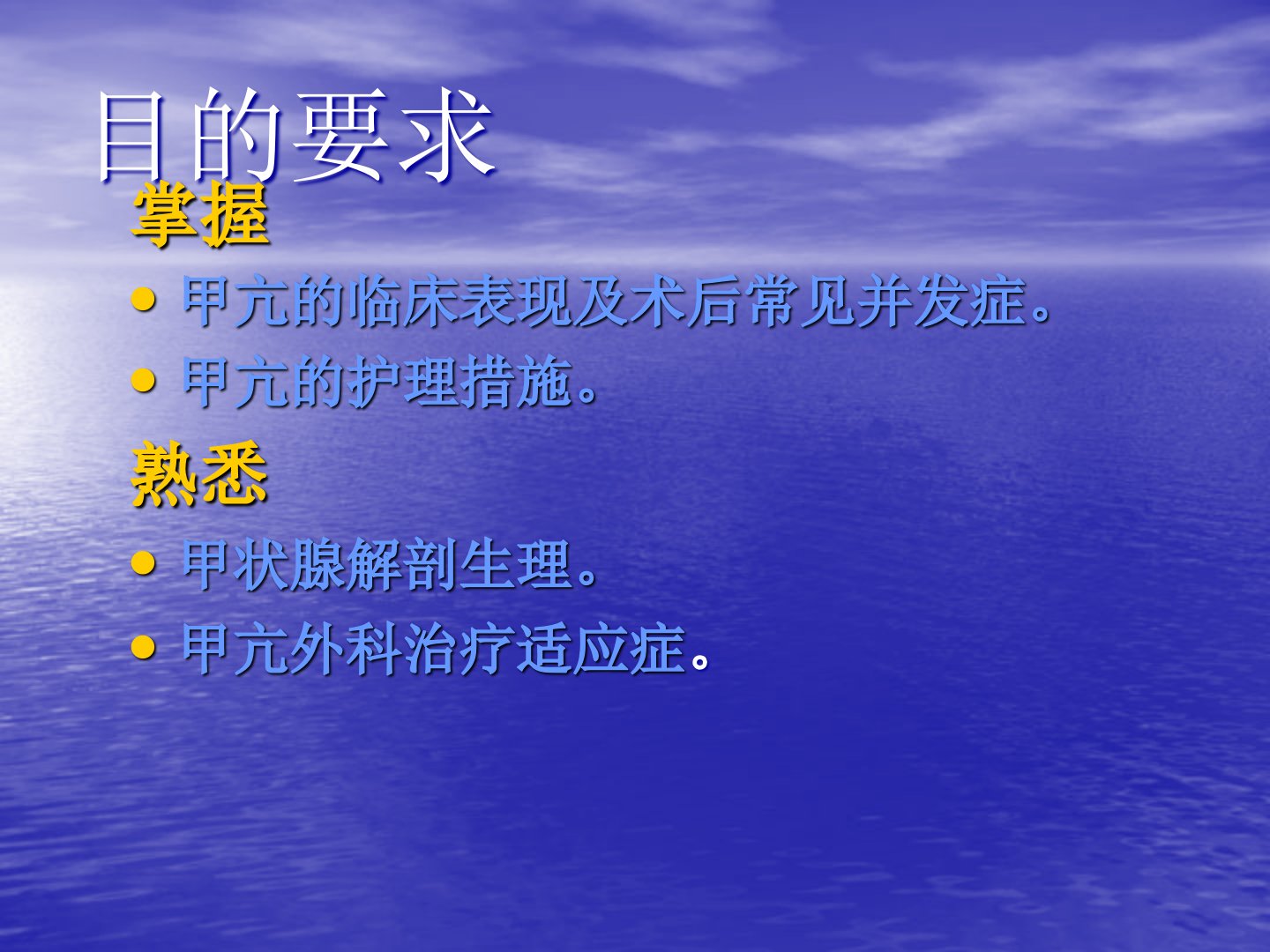 甲亢患者术后的护理课件目的要求掌握甲亢的临床表现及术后常见并发症。甲亢的护理措施。熟悉甲状腺解剖生理。甲亢外科治疗适应症。第一节解剖生理甲状腺位于颈前区甲状软骨下方、气管的两旁,由左右两侧叶和中央峡部构成,峡部可向上伸出一椎叶体。成人甲状腺重约30g。甲状腺形态呈H形左右两叶+峡部+锥状叶(70%)解剖喉返神经:声带运动喉上神经外:运动内:感觉甲状旁腺紧密附着在左右两叶甲状腺背面的内侧。上下两对,共四个。外观呈黄、红或棕红色,腺体扁平、卵圆形、质软。分泌甲状旁腺素(PTH),调节体内钙的代谢并维持钙和磷的平衡。甲状旁腺损伤可引起低钙性抽搐甲状腺的被膜外层被膜:甲状腺外科被膜,属气管前筋膜内层被...