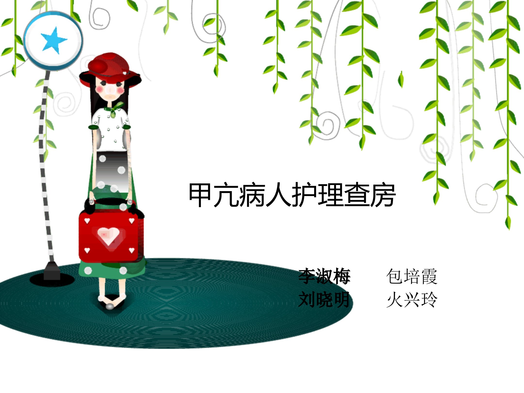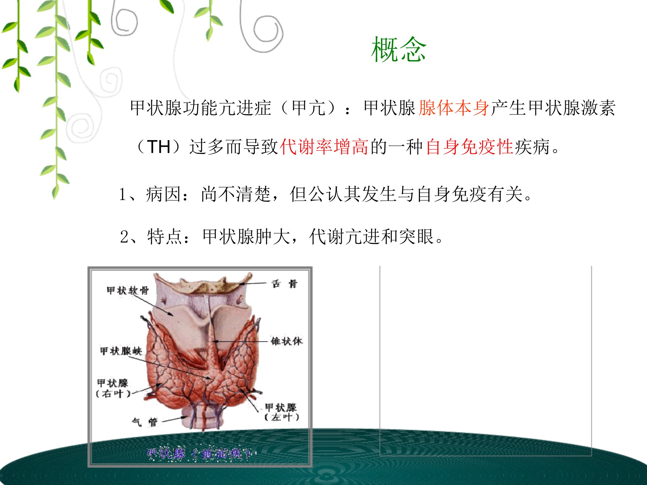 李淑梅包培霞刘晓明火兴玲甲亢病人护理查房1疾病相关知识2患者基本信息3主要护理问题、措施及评价4出院健康指导Content概念甲状腺功能亢进症(甲亢):甲状腺腺体本身产生甲状腺激素(TH)过多而导致代谢率增高的一种自身免疫性疾病。1、病因:尚不清楚,但公认其发生与自身免疫有关。2、特点:甲状腺肿大,代谢亢进和突眼。临床表现典型表现:TH分泌过多所致的高代谢症群、甲状腺肿及眼征,老年和小儿病人表现多不典型。(一)甲状腺激素分泌过多的表现1)高代谢综合征:TH升高→促进三大物质代谢→产热与散热均明显增多→怕热多汗、皮肤温暖潮湿、低热、体重下降。2)精神、神经系统:T3、T4升高→神经系统兴奋性升高...