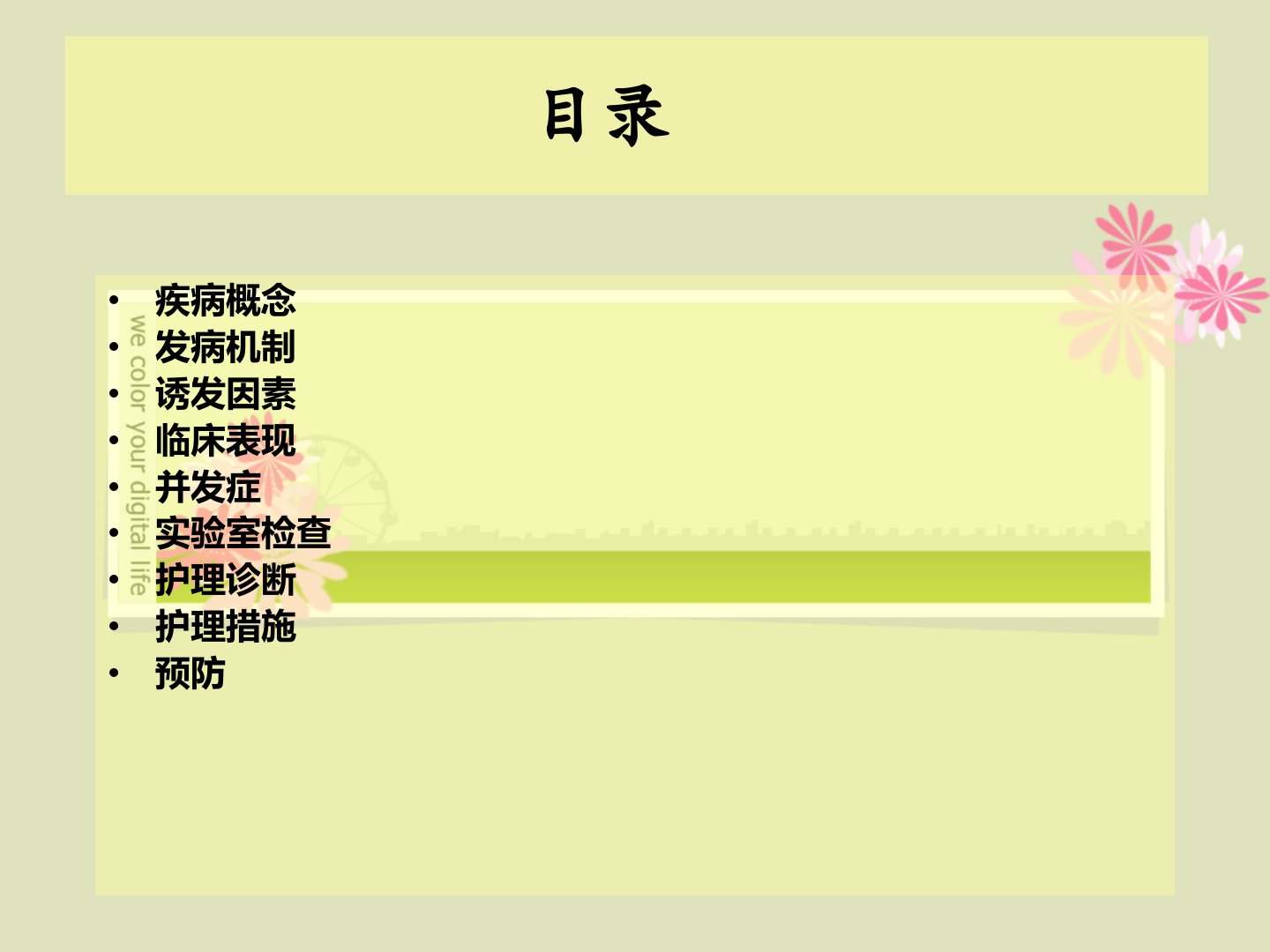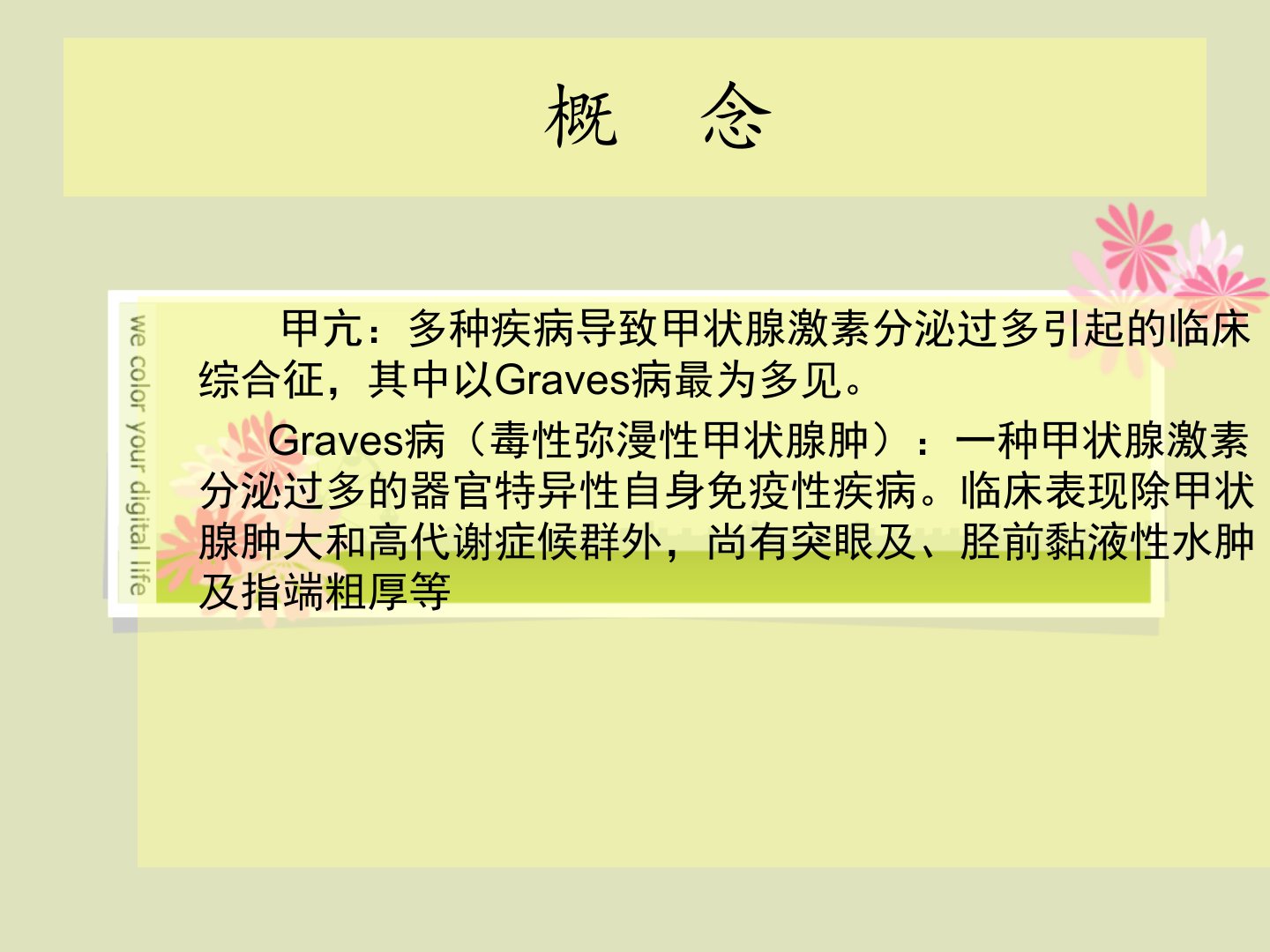 甲亢疾病综述甲亢是多种疾病致甲状腺激素分泌过多引发的临床综合征以Graves病最为多见。Graves病是器官特异性自身免疫性疾病与机体自身免疫异常有关有一定遗传倾向在感染、精神创伤等因素作用下易诱发。其诱发因素与自身免疫、遗传和环境密切相关感染、外伤、精神刺激等都可能引发。临床表现多样男女比例1:46典型表现有高代谢症候群、甲状腺肿大、眼征等还有特殊临床表现及类型如甲状腺危象、甲亢性心脏病等。并发症包括甲亢型心脏病、周期性麻痹等多种病症。实验室检查有血清甲状腺素测定等多种方式。护理诊断涵盖营养失调、个人应对无效等问题护理措施包括提供高热量饮食、解释病情减少刺激等。预防方面未病先预防要保持精神愉快、合理饮食;既病防传变要早期确诊治疗;愈后防复发要综合调理、定期检查。