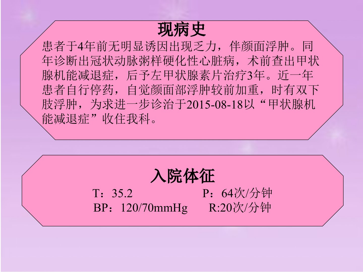 70岁女性患者李xx主诉乏力伴颜面浮肿4年心悸双下肢浮肿3天。4年前患者确诊冠状动脉粥样硬化性心脏病术前查出甲状腺机能减退症予左甲状腺素片治疗3年后自行停药近一年自觉颜面部浮肿加重时有双下肢浮肿为求诊治收住内分泌科。辅助检查示游离三碘甲状腺原氨酸低、促甲状腺素高且伴有心血管、脑部等多处病变初步诊断为甲状腺机能减退症等多种疾病。甲状腺机能减退症简称甲减是由各种原因导致的低甲状腺激素血症或甲状腺激素抵抗而引起的全身性低代谢综合征分为原发性、中枢性和TH抵抗综合征病因包括自身免疫损伤、碘过量等临床表现为易疲劳、怕冷、体重增加等严重者出现黏液性水肿昏迷。治疗上采用左甲状腺素钠等药物。护理方面针对便秘、体温过低、潜在并发症等问题采取相应护理措施同时关注患者营养、活动、心理等方面给予疾病知识指导和用药指导告知患者防止病因、配合治疗、自我检测的重要性。