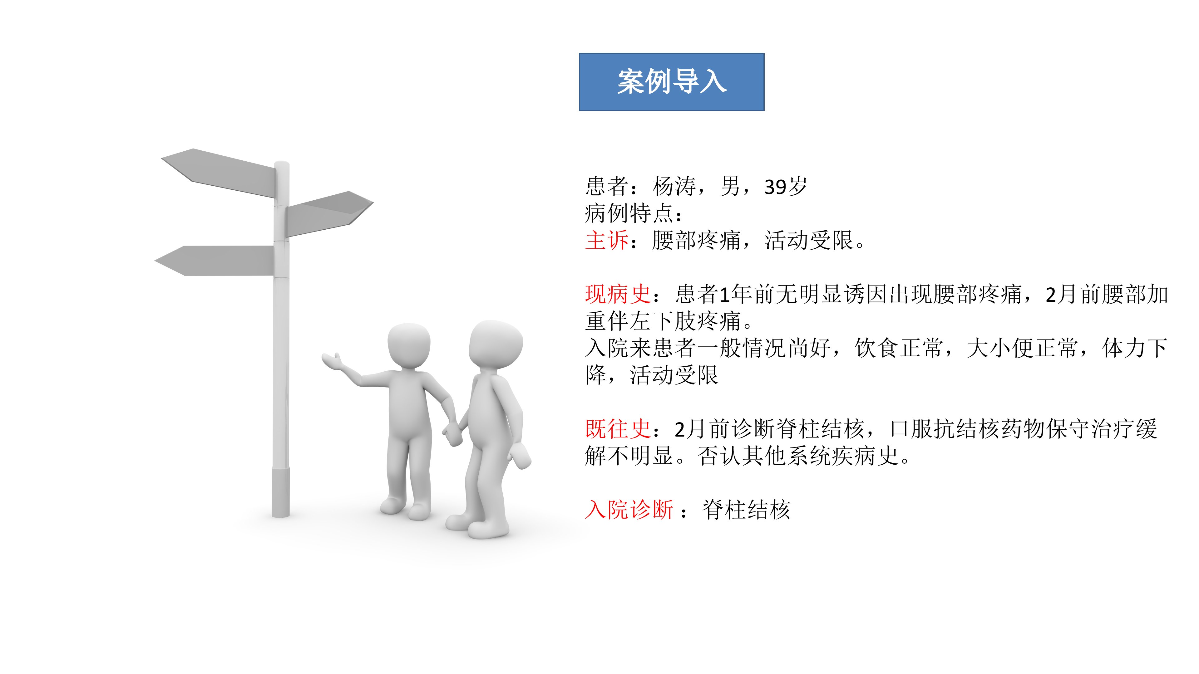 患者杨涛39岁主诉腰部疼痛、活动受限1年前无明显诱因出现腰部疼痛2月前加重伴左下肢疼痛2月前诊断为脊柱结核口服抗结核药物保守治疗缓解不明显。脊柱结核由结核分支杆菌侵入骨或关节引起发病率居骨与关节结核首位腰椎发病率最高其次为胸椎、颈椎分中央型和边缘型寒性脓肿为其特征性表现。临床表现包括起病缓慢、午后低热、消瘦、疲乏等疼痛是最早出现的症状多轻微钝痛劳累、咳嗽等时加重还可伴放射性疼痛。姿势异常出现斜颈、头前倾等。实验室检查方面ESR、CRP、结核菌素试验在结核活动期间明显增快。影像学检查可显示病灶部位等。治疗包括全身支持治疗、抗结核药物治疗、手术治疗。护理诊断有体温过高、营养失调、疼痛、低效性呼吸型态针对不同诊断采取相应护理措施如降温、改善营养状况、合理用药止痛、加强病情观察等经护理患者症状缓解血红蛋白上升。
