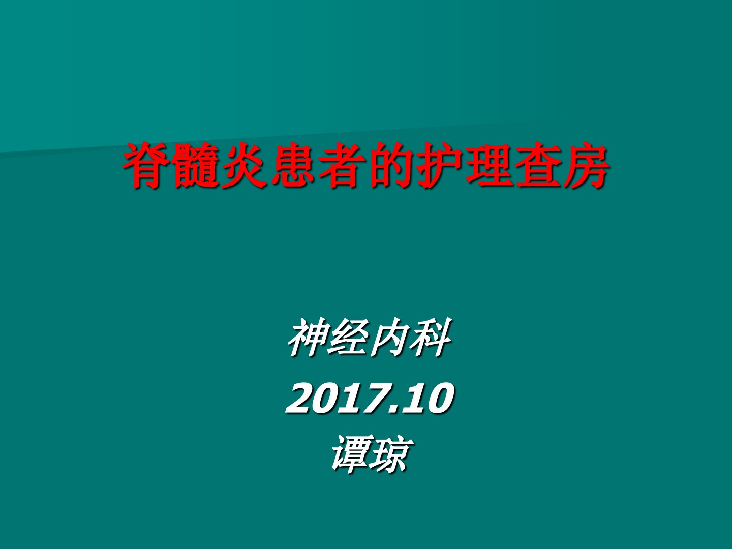 2017年10月神经内科谭琼医生进行了脊髓炎患者的护理查房。急性脊髓炎是脊髓白质脱髓鞘或坏死所致的急性横贯性损害病因未明可能与病毒感染或机体自身免疫反应有关。流行病学上散在发病未见流行趋势。病理上节段T35最常见脊髓肿胀、质地变软切面脊髓软化边缘不整。临床表现包括感觉障碍、自主神经功能障碍(如括约肌功能障碍导致的尿失禁)等。患者涂金英63岁女性突发左下肢麻木、胸部刺痛后出现行走不稳诊断为“脊髓炎”并伴有肺部感染。护理诊断包括躯体活动障碍、知识缺乏、焦虑、尿失禁、有皮肤完整性受损的危险、舒适的改变及有窒息的危险。护理措施包括生活护理、安全护理、心理护理、对症护理等如保持床单位整洁干燥、防止跌倒、鼓励患者配合治疗、促进膀胱收缩、防止压疮等。经治疗和护理患者胸痛消失情绪稳定能配合治疗但仍不能自主排尿需留置导尿未发生压疮和窒息。健康教育方面向患者和家属介绍了本病的病因、治疗及预后相关知识鼓励表达感受加强营养适当康复锻炼注意安全预防皮肤损伤。