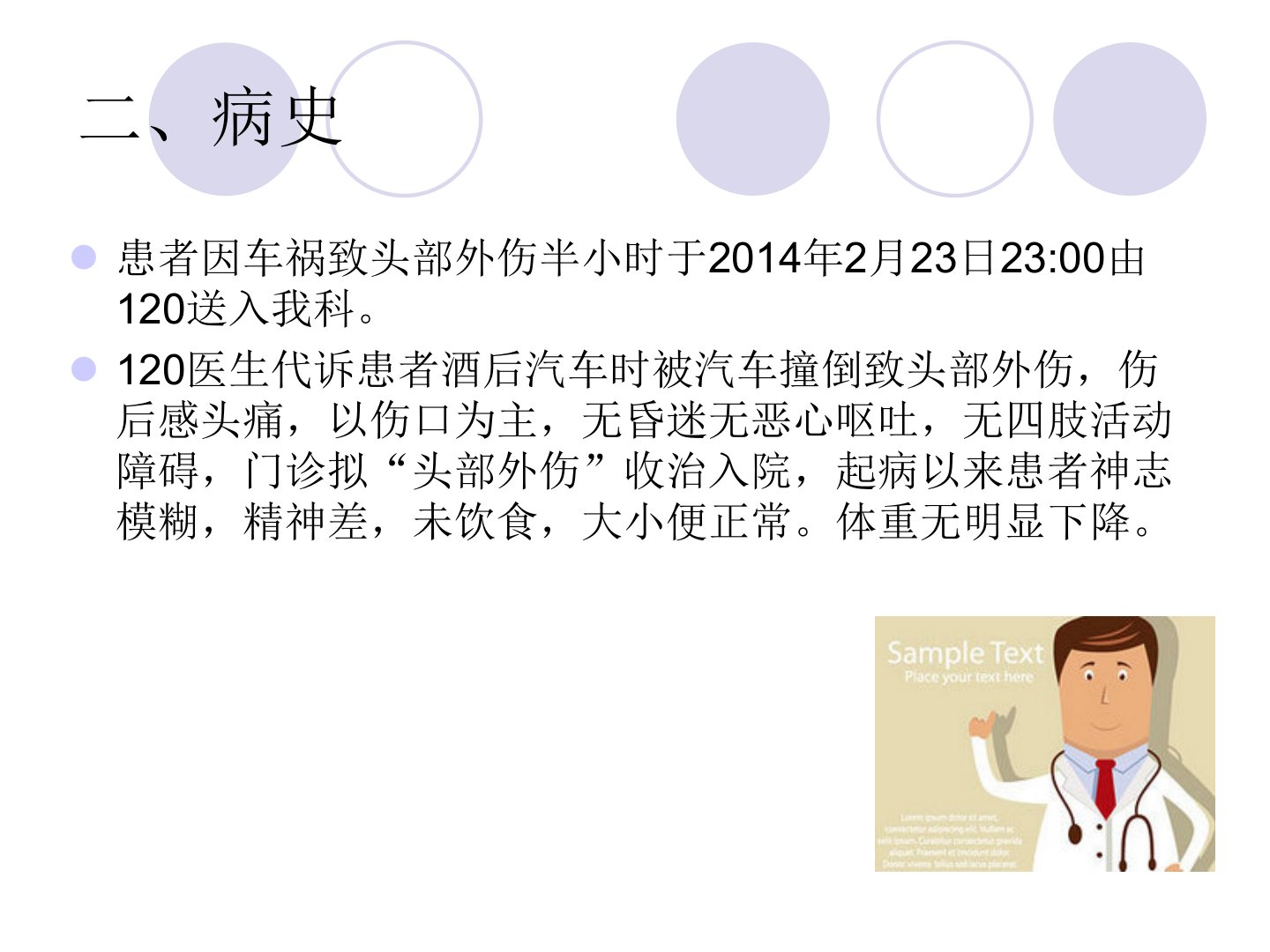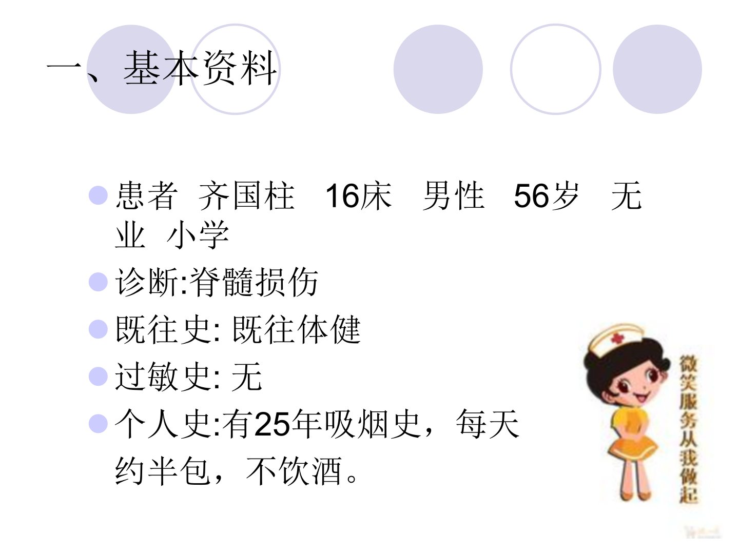 患者齐国柱56岁男性因车祸致头部外伤被送入神经外科诊断为脊髓损伤。患者有25年吸烟史无其他既往病史和过敏史。入院时患者神志模糊有头部和颜面部皮肤裂伤四肢肌力正常。头颅CT和MRI显示右侧颞叶脑挫裂伤、左侧眼眶内壁骨折、C46段后缘脊髓损伤等。护理中针对其焦虑恐惧、知识缺乏、气体交换受损、体温过高或过低、皮肤完整性受损、感染等问题采取了相应措施包括入院宣教、讲解疾病知识、保持气道通畅、吸氧、应用激素减轻脊髓水肿、加强呼吸道护理、物理方法调节体温、轴线翻身预防压疮、定时测量体温、使用抗生素预防感染等。经治疗和护理患者焦虑情绪减轻能复述疾病知识气体交换正常体温正常皮肤完好未发生感染。出院时医生指导患者继续康复锻炼并给出了饮食、导尿等方面的建议。
