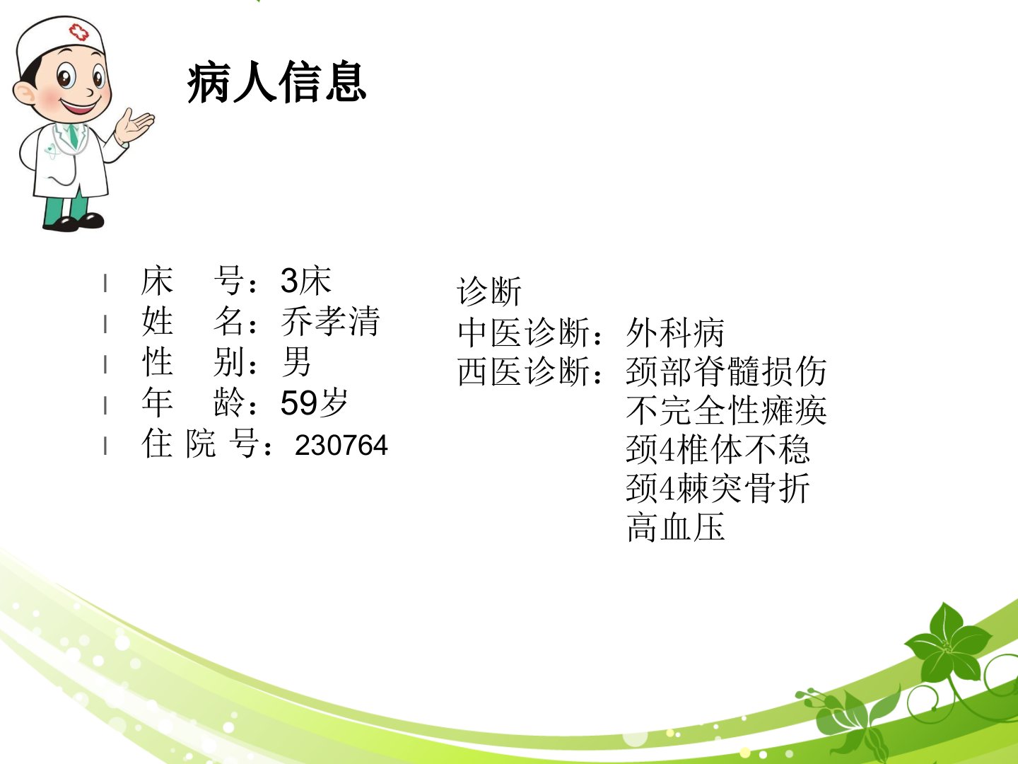 2018年4月17日ICU病房进行了护理病例讨论患者为59岁男性乔孝清因“坠床致颈部损伤伴四肢不全瘫”入院诊断为颈部脊髓损伤不完全性瘫痪、颈4椎体不稳、颈4棘突骨折和高血压。患者入院时神志清但双上肢疼痛右侧肢体无法活动左侧肢体活动不利。治疗上请骨科会诊后采用了中西结合治疗包括激素冲击、神经修复、减轻水肿等措施。护理方面针对患者呼吸形态改变、疼痛、活动障碍、焦虑、皮肤受损危险和潜在并发症等问题制定了相应护理措施包括头高30度卧位、妥善固定气管、按需吸痰、适时湿化、静脉补钾、物理降温、营养支持、卧气垫床、定时翻身拍背等。护理目标包括患者有效咳嗽咳痰、血钾正常、体温正常、营养得到保证、鼻饲顺利、住院期间未发生压疮、预防并及时处理并发症等经评估均取得良好护理效果。讨论环节涉及拔管后患者排痰、低垂部位水肿处理和亚低温治疗注意事项。