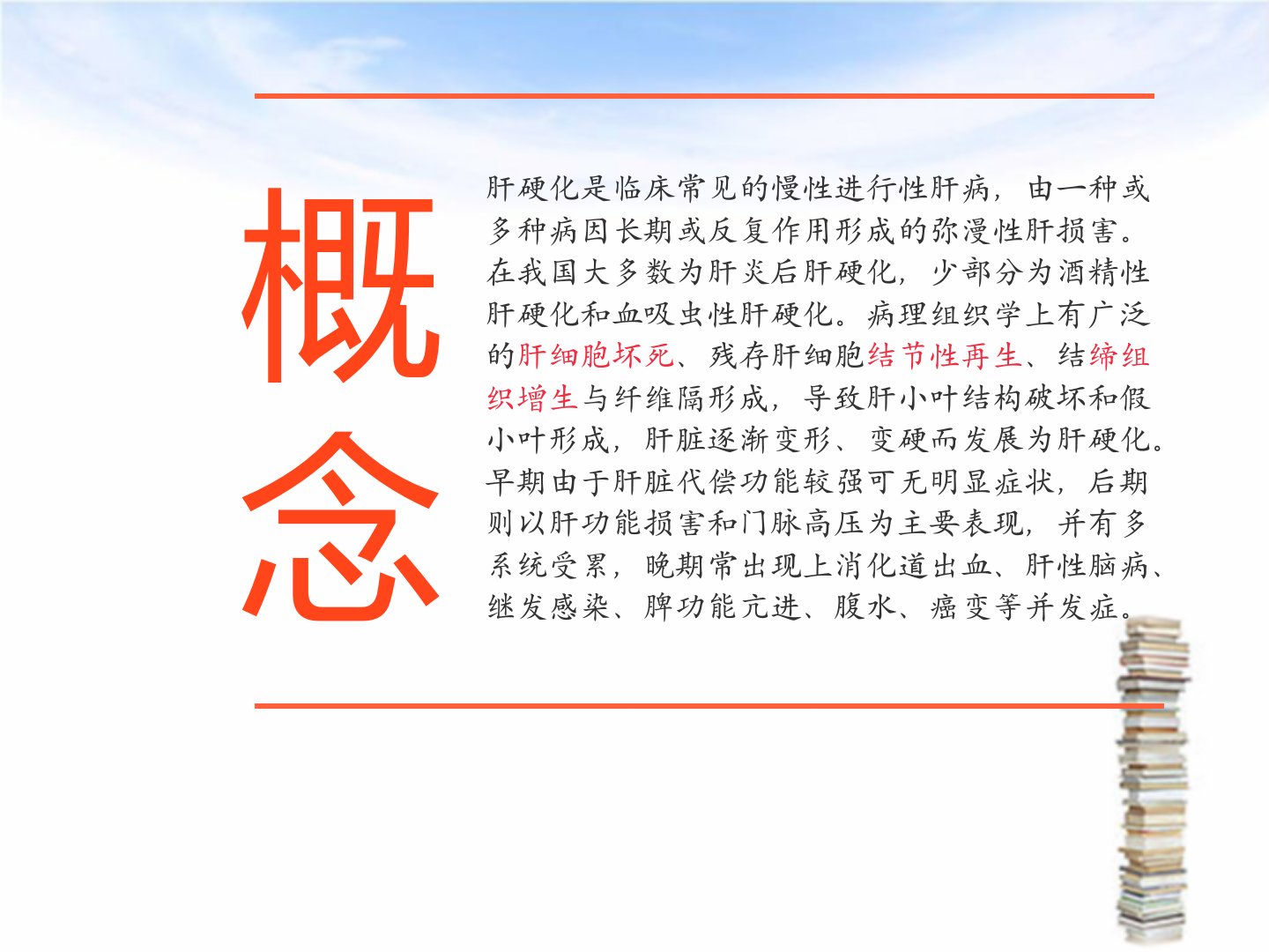 肝硬化摘要主讲人朱亚婷从多方面对肝硬化进行了讲解。肝硬化是临床常见的慢性肝病由多种病因长期作用形成我国大多为肝炎后肝硬化少部分为酒精性或血吸虫性肝硬化。病理组织学上有广泛的肝细胞坏死等情况早期可无明显症状后期以肝功能损害和门脉高压为主要表现晚期常出现多种并发症。其病因多样包括病毒性肝炎、酒精中毒、胆汁淤积等。临床表现上起病隐匿分为代偿期和失代偿期后者有肝功损害及门脉高压症候群。辅助检查有实验室、影像学、内镜等多种检查方式。治疗目前尚无根治办法主要是早期发现和阻止病程进展包括支持、保肝、降酶、退黄等治疗以及针对并发症的治疗。护理方面存在营养失调、体液过多等诊断护理措施包括生活、病情观察、心理等多方面护理。