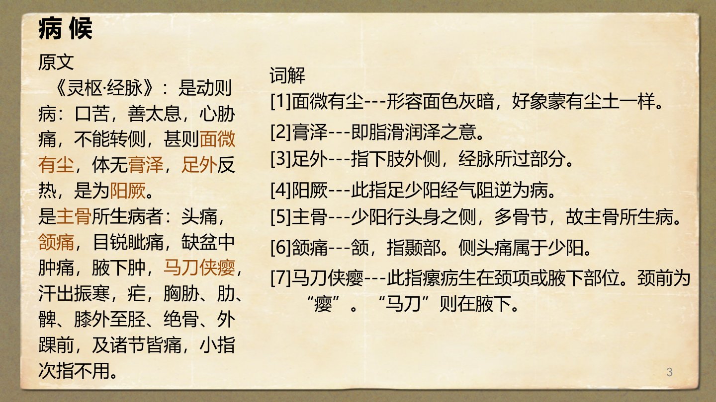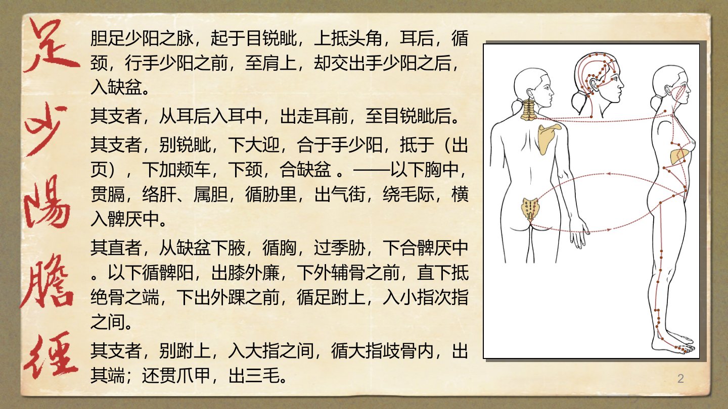 经络腧穴学胆足少阳之脉摘要胆足少阳之脉循行路径复杂起于目锐眦上抵头角等多处其支脉也有特定走向。病候上本经异常变动会致口苦、善太息等症状本经所属腧穴能主治“骨”相关病症如头痛、颔痛等。主要病候包括口苦、目疾、疟疾、多种部位疼痛及小指次指不用等。主治概要涵盖头面五官疾病、神志病、热病、肝胆胁肋病、外经病。文中还介绍了多个穴位:听会穴是治疗耳疾要穴可缓解耳部疾患、齿痛面病等;阳白穴能清头明目、祛风泄热;风池穴可疏风解表治疗多种病症;肩井穴能祛风清热、通乳止痛;日月穴可疏肝利胆;环跳穴能疏经活络;风市穴可祛风化湿;阳陵泉是筋会穴功能多样;悬钟穴为髓会可治疗骨髓相关疾病等。各穴位定位、作用、主治及应用操作各有特点。