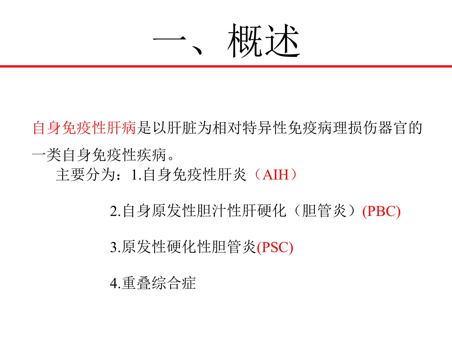 自身免疫性肝病内容一、概述二、临床表现三、诊断依据四、治疗原则一、概述自身免疫性肝病是以肝脏为相对特异性免疫病理损伤器官的一类自身免疫性疾病。主要分为:1.自身免疫性肝炎(AIH)2.自身原发性胆汁性肝硬化(胆管炎)(PBC)3.原发性硬化性胆管炎(PSC)4.重叠综合症1.自身免疫性肝炎(AIH):一种由针对肝细胞的自身免疫反应所介导的肝脏实质炎症,以血清自身抗体阳性、高免疫球蛋白G(IgG)和(或)γ-球蛋白血症、肝组织学上存在界面性肝炎为特点,如不治疗常可导致肝硬化、肝衰竭。2.原发性胆汁性肝硬化(PBC):一种慢性肝内胆汁淤积性疾病。其发病机制尚不完全清楚,可能与遗传背景及环境等因素相...
