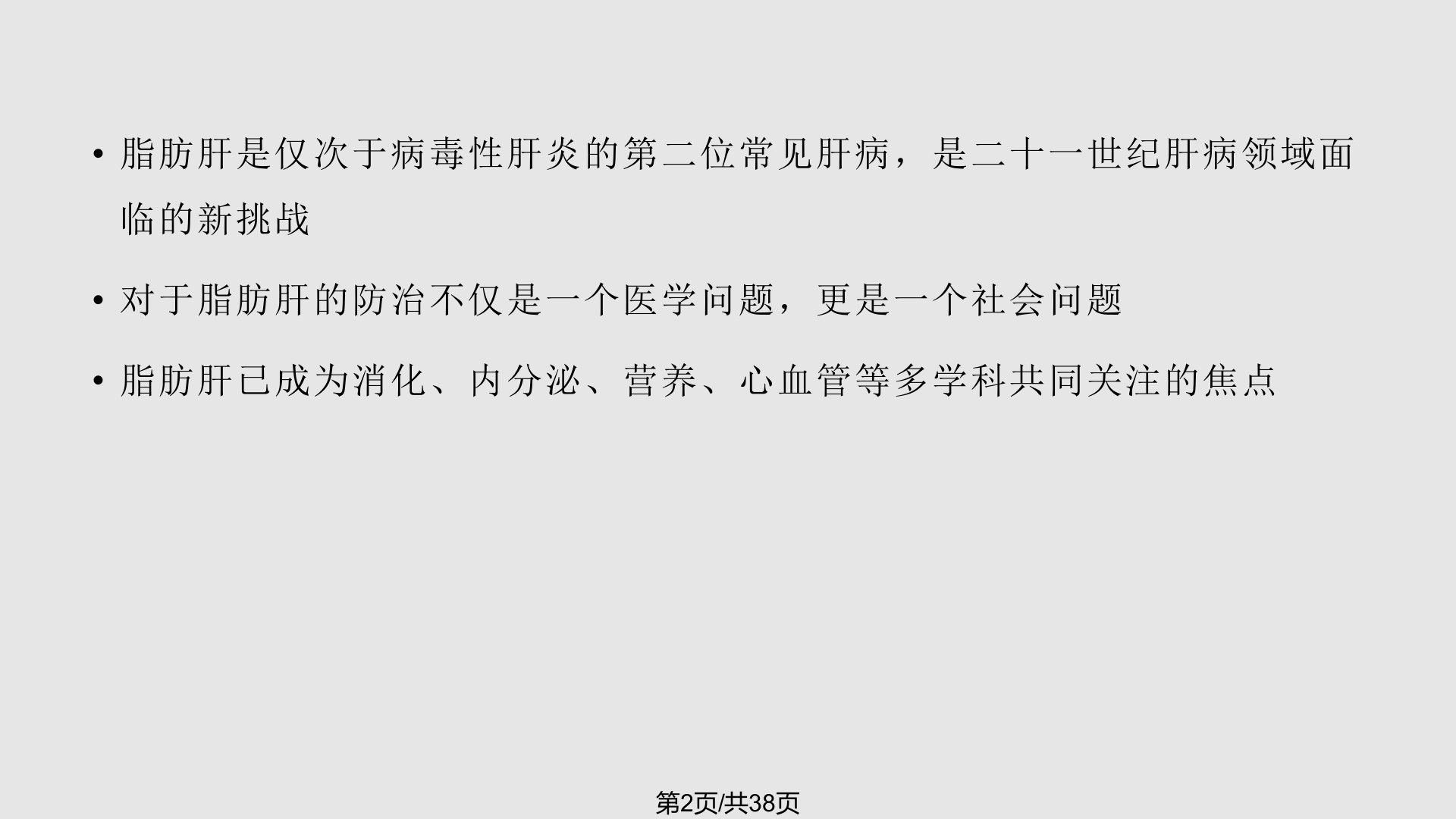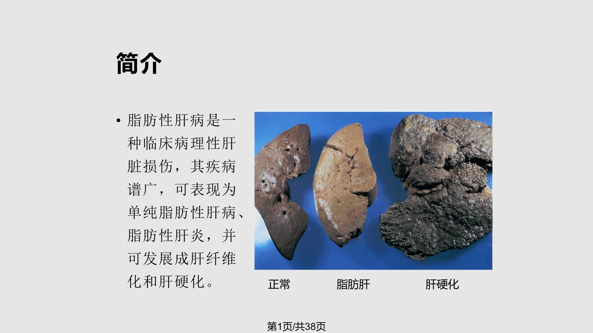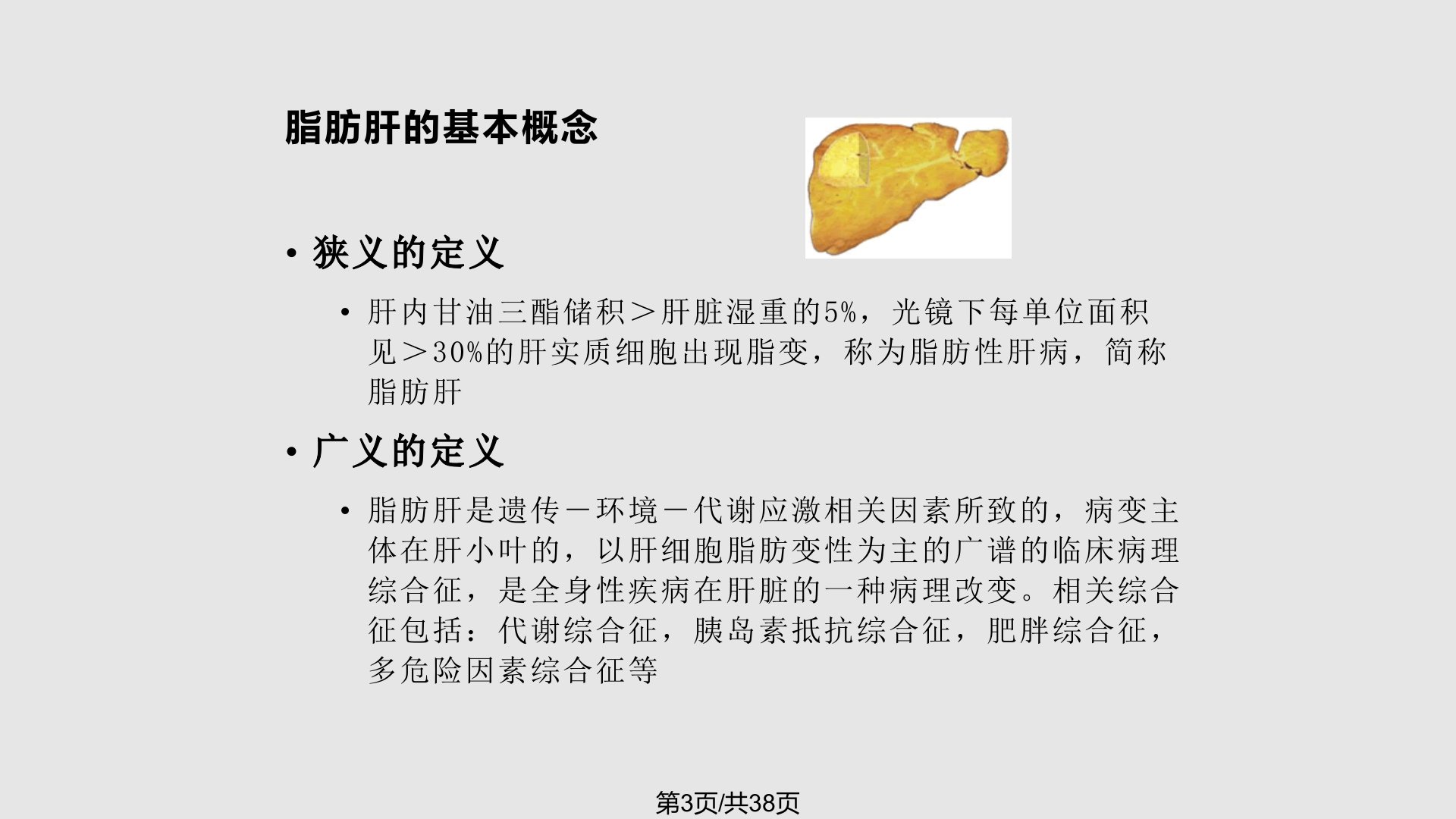 脂肪性肝病是仅次于病毒性肝炎的第二大常见肝病疾病谱广可发展为肝纤维化和肝硬化已成为多学科焦点。其狭义定义为肝内甘油三酯储积超肝脏湿重5广义上指遗传、环境、代谢应激相关因素导致的肝细胞脂肪变性为主的临床病理综合征。病因包括肥胖症(占50左右)、饮酒、体重变化、糖尿病、高脂血症、慢性肝损、接触工业毒物及特殊药物等。肥胖是脂肪肝重要诱因我国超重和肥胖率逐年升高肥胖不仅诱发多种疾病还严重影响患者的生活质量和预期寿命。酒精性肝病严重程度与饮酒量、时间及个体等因素有关9095的酒精在肝内转化为乙醛。脂肪肝与代谢综合征密切相关常与高血压、糖尿病等并存。诊断上酒精性肝病有特定饮酒史标准。治疗需去除病因包括饮食治疗、运动治疗等。饮食治疗需适宜热能摄取合理分配营养要素。治疗目标包括改善血脂、血糖等减肥对肝病有积极影响但需防止不当减肥。保肝和降酶药物需在医生指导下使用。预防需平衡清淡膳食、适当运动。