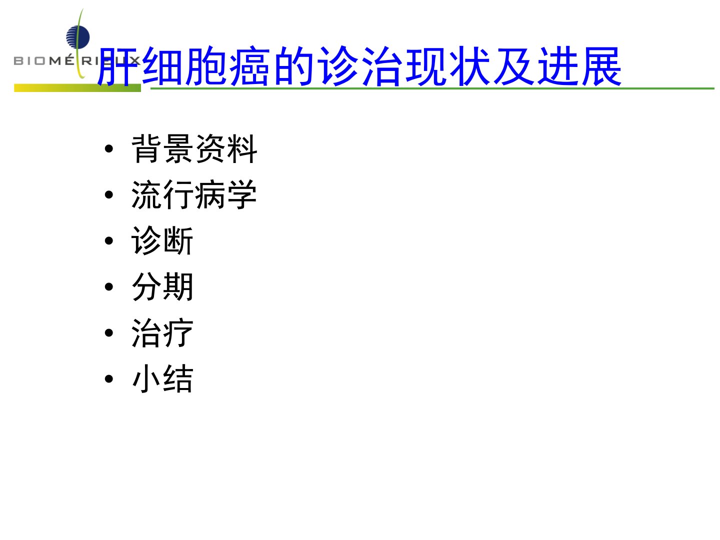 我国是肝癌高发国家尽管乙肝疫苗已普及但肝癌发病率仍在上升。其危险因素包括病毒性肝炎、肝硬化、饮用水污染、酒精、黄曲霉素、寄生虫及口服避孕药等糖尿病和肥胖也是协同因素。在预防和筛查方面全球多国已将HBV疫苗纳入婴幼儿免疫计划。在诊断上肿瘤标志物和影像诊断技术不断进步如MDCT的MIP及CTA、CEMRI等提高了小病灶检出率。病理诊断可评估肝癌的分子分期、克隆起源、血管侵犯等。常见肝癌分期系统包括TNM、JISS、CLIP、BCLC等其中BCLC分期系统被广泛采用。治疗上外科治疗(部分肝切除、肝移植)、介入治疗(血管介入、非血管介入)、靶向治疗等手段多样。微创是发展趋势生存获益是评价疗效的最主要指标规范化综合序贯治疗是关键。