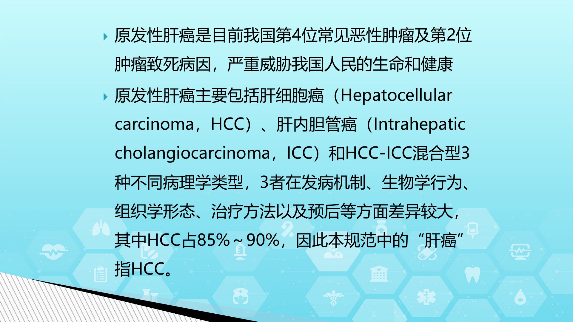 《原发性肝癌诊疗规范(2019年版)》摘要原发性肝癌是我国常见恶性肿瘤及致死病因主要包括肝细胞癌(HCC)、肝内胆管癌(ICC)和混合型其中HCC占8590本规范“肝癌”指HCC。1筛查诊断:高危人群每6个月用肝脏超声联合血清AFP筛查;筛查异常者首选动态增强CT和多模态MRI明确诊断;肝癌影像学诊断依据“快进快出”强化方式;多模态MRI是优选影像技术;PETCT有助于分期及疗效评价;有典型特征的肝占位性病变通常无需穿刺活检;血清AFP阴性人群可借助其他指标早期诊断。病理学诊断要注意标本处理、取材规范及报告内容全面。2治疗:强调多学科诊疗团队模式。治疗手段多样肝切除术是重要手段原则是完整切除肿瘤并保留有功能肝组织有严格的术前评估条件;肝移植适用于特定早期肝癌病人推荐UCSF标准;局部消融治疗适用于特定分期肝癌有多种消融方式;TACE是常用非手术治疗方法要规范操作并提倡综合治疗;放射治疗适用于不同分期肝癌病人;晚期肝癌病人可参加临床试验有多种姑息治疗方案同时要控制基础肝病。此外肝癌破裂是潜在致死性并发症要根据病人情况制订个体化治疗方案。
