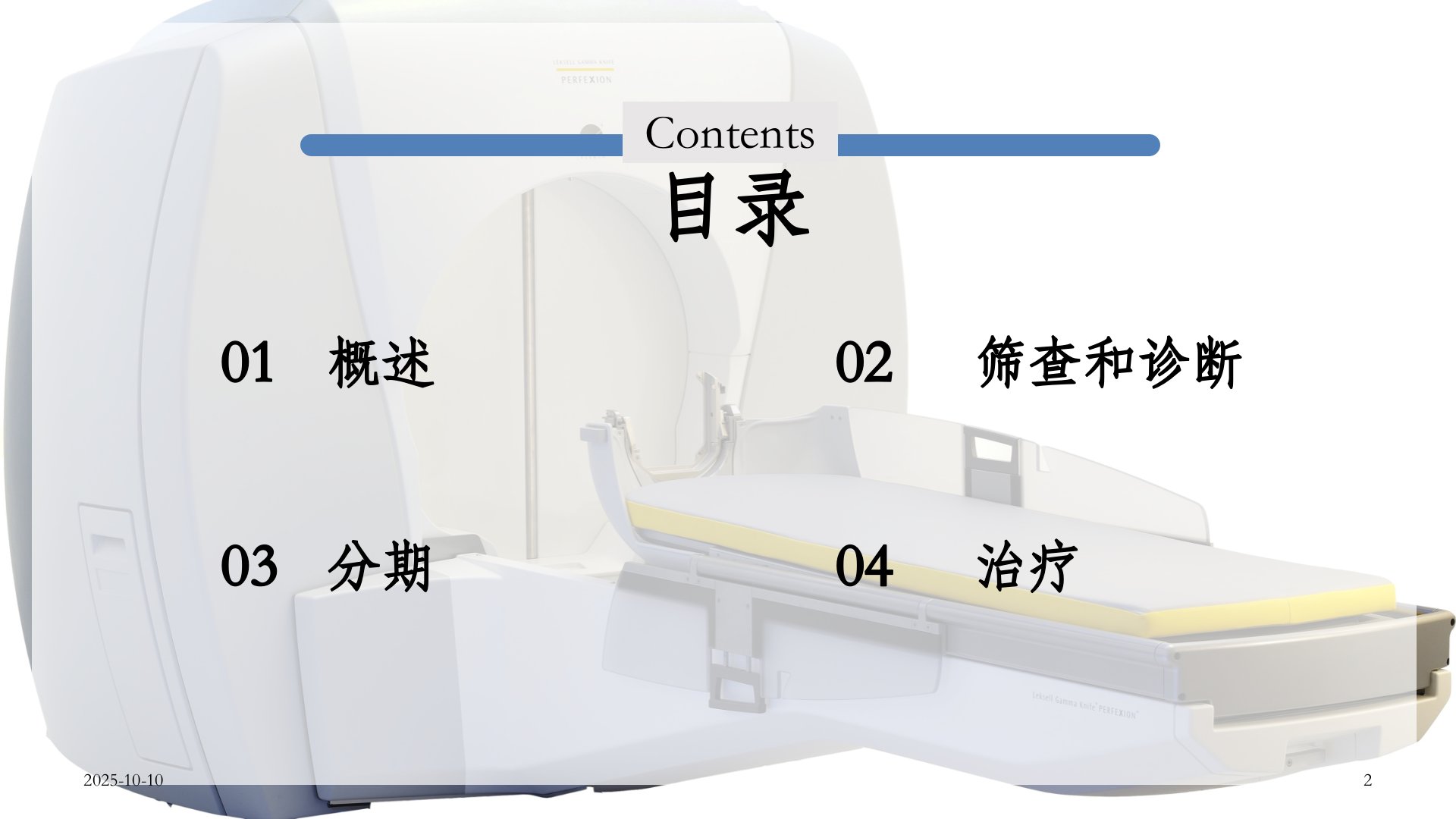 原发性肝癌诊疗规范——2017版——Contents目录01020304概述筛查和诊断分期治疗概述PART01原发性肝癌是目前我国第四位的常见恶性肿瘤及第三位的肿瘤致死病因,严重威胁我国人民的生命和健康一、概述summary主要包括肝细胞癌、肝内胆管癌和混合型三种不同病理类型,三者在发病机制、生物学行为、组织学形态、治疗方法以及预后等方面差异较大,其中肝细胞癌占到85%-90%以上,因此本规范中的“肝癌”指肝细胞癌筛查和诊断PART020102030405高危人群的监测筛查肝癌的影像学检查肝癌的血清学分子标记物肝癌的病理学诊断肝癌的临床诊断标准及路线图二、筛查和诊断(一)高危人群的监测筛查对肝...