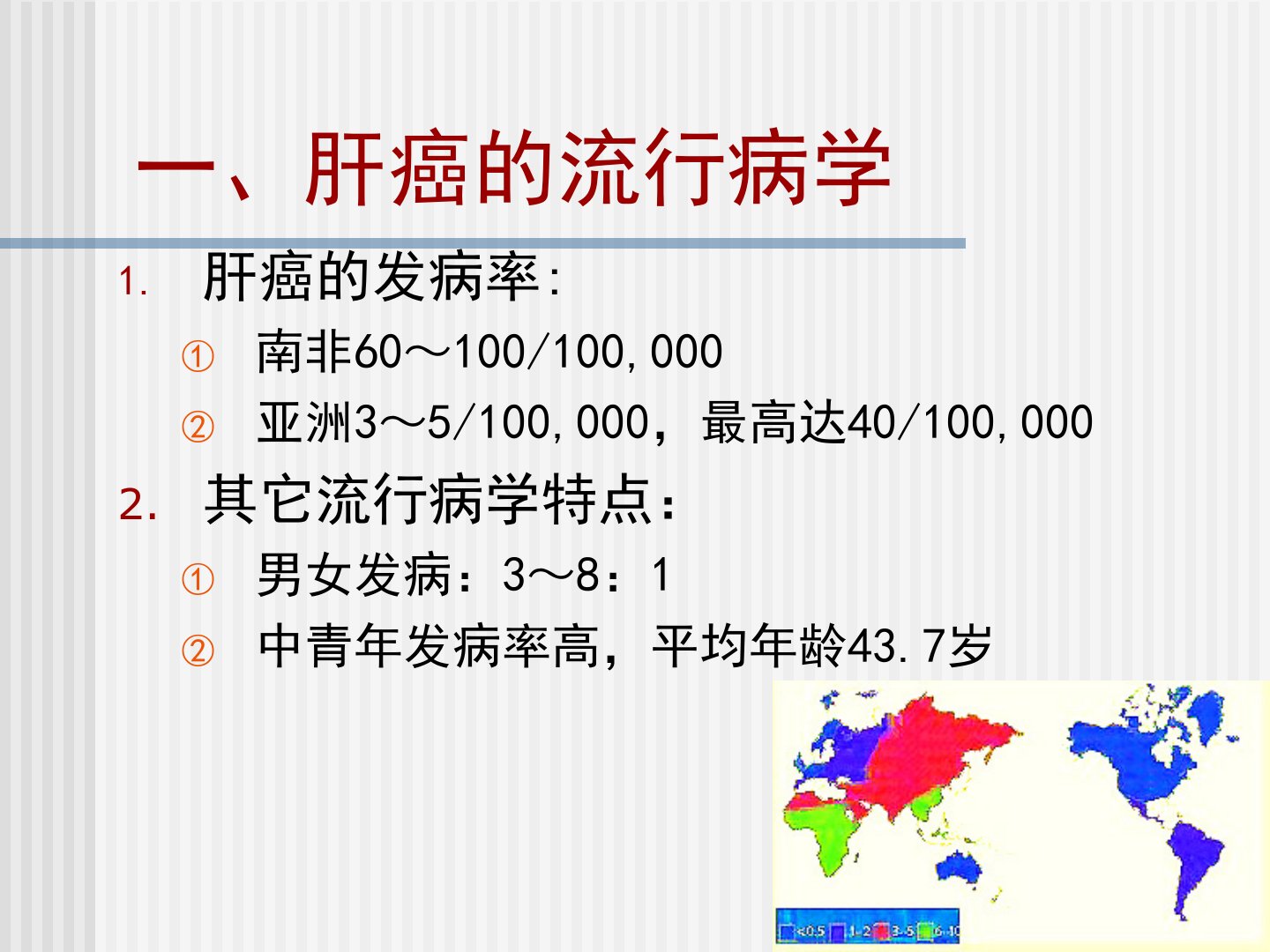 原发性肝癌摘要主讲人孙凯介绍了原发性肝癌多方面知识:1流行病学:发病率在南非、亚洲较高男女发病比38:1中青年高发平均年龄437岁。2发病机理:7090亚洲肝癌患者为HBV携带者国内超85;7085肝癌发生于肝硬化肝细胞代偿增生基础上;黄曲霉素B1污染重还有亚硝胺类化合物等致癌物。3分型及分期:大体标本分巨块型、弥漫型;病理细胞学分肝细胞型等四级;按病程分亚临床前期、临床前期、临床期。4转移途径:肝内播散、血行转移、淋巴转移还可直接侵犯和腹腔播种。5临床表现:早期症状隐匿典型症状有肝区疼痛等中晚期肝肿大常见。6诊断:早期诊断是前提特征为慢性肝病史等;血清学检测AFP特异性高;影像学检查各有优势;肝活检穿刺有风险。7鉴别诊断:需与肝血管瘤等多种疾病鉴别。8治疗原则:早期发现诊断治疗及综合治疗是关键早期手术最有效中晚期有多种治疗方式。9小结:肝癌发病率上升且年轻化诊断治疗多样总体治疗效果显著提高。