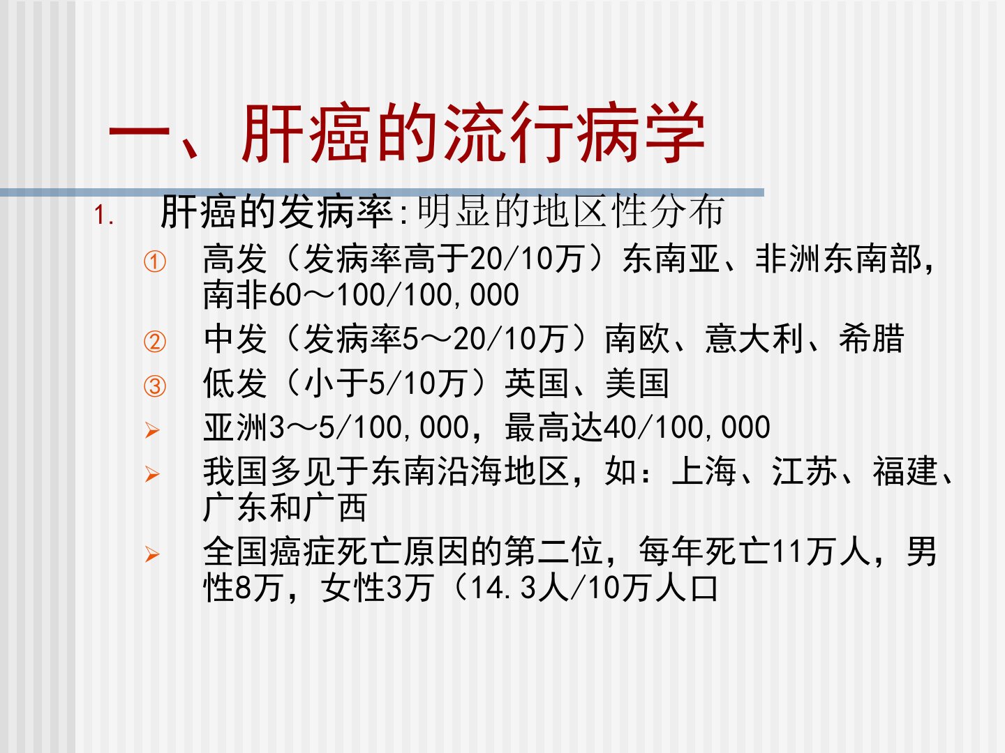 原发性肝癌PrimaryliverCancer一、肝癌的流行病学肝癌的发病率:明显的地区性分布高发(发病率高于20/10万)东南亚、非洲东南部,南非60~100/100,000中发(发病率5~20/10万)南欧、意大利、希腊低发(小于5/10万)英国、美国亚洲3~5/100,000,最高达40/100,000我国多见于东南沿海地区,如:上海、江苏、福建、广东和广西全国癌症死亡原因的第二位,每年死亡11万人,男性8万,女性3万(14.3人/10万人口2.其它流行病学特点:男女发病:3~8:1中青年发病率高,平均年龄43.7岁二、肝癌的发病机理病毒性肝炎:亚州肝癌患者70~90%为HBV携带者,国...