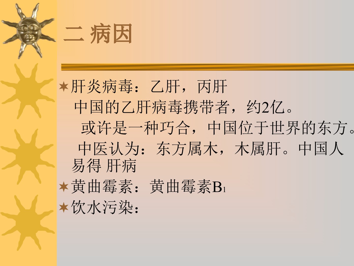原发性肝癌年发约13万人死亡率居第三。病因包括肝炎病毒(乙肝、丙肝为主中国乙肝病毒携带者约2亿)、黄曲霉素、饮水污染等。病理学上大体分型包括弥漫型、结节型、块状型等组织学分型以肝细胞癌为主。临床表现涵盖症状、体格检查、癌旁综合征及并发症。诊断需与AFP阳性和阴性疾病鉴别如妊娠、急慢性肝炎、消化道肿瘤等。临床分期分为三期I期无明显症状III期为晚期。治疗首选手术肝动脉栓塞化疗(TACE)适用于不能切除的肿瘤等情况放射治疗、超声引导下瘤内注射、化疗等也有应用。此外还有生物治疗、非切除手术(冷冻、激光等)及综合序贯治疗等多种手段中医中药可作为辅助治疗。