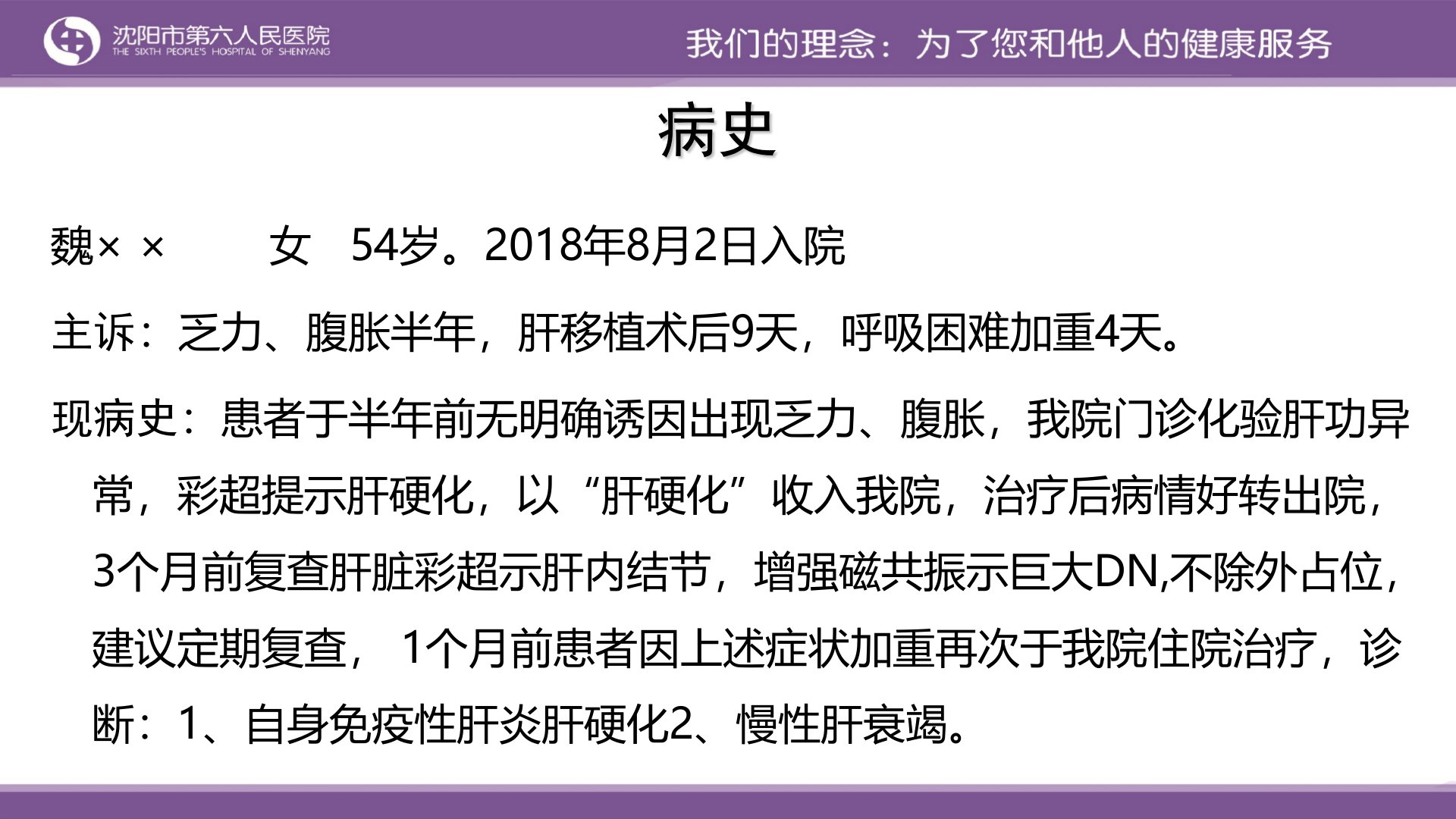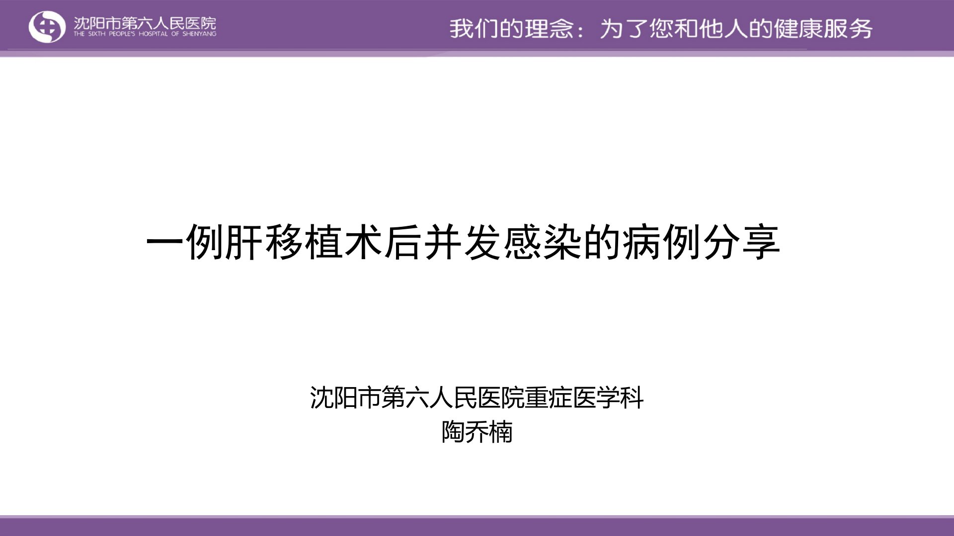 一例肝移植术后并发感染的病例分享摘要本文分享一例54岁女性肝移植术后并发感染的病例。患者因乏力、腹胀半年肝移植术后9天、呼吸困难加重4天入院。病史显示患者半年前出现症状后确诊为自身免疫性肝炎肝硬化、慢性肝衰竭两周前转至郑州大学附属一院并于1周前行肝移植术4天前因呼吸困难检查提示肺部感染入ICU机械通气治疗。现患者带呼吸机转入沈阳市第六人民医院ICU诊断为肝移植术后重症肺炎。体格检查示患者面色晦暗、皮肤粘膜轻度黄染、有肝掌切口有渗液各引流管通畅。入院化验显示多项指标异常。入院后给予重症监护、机械通气、抗感染抗排斥等治疗。文中探讨了移植后感染的易发因素面临感染原发灶、肝肾功能异常原因等诸多问题。治疗分阶段进行根据痰培养、引流液培养结果调整用药。后患者出现失血、急性肝损伤等情况经处理后因经济原因停药。转出前化验部分指标好转但仍异常。最后提出对脏器移植术后复杂感染的抗感染治疗及肝下静脉闭塞与感染关系的思考强调对肝移植患者术前危险因素及时评估、密切监测和处理复杂感染的重要性。