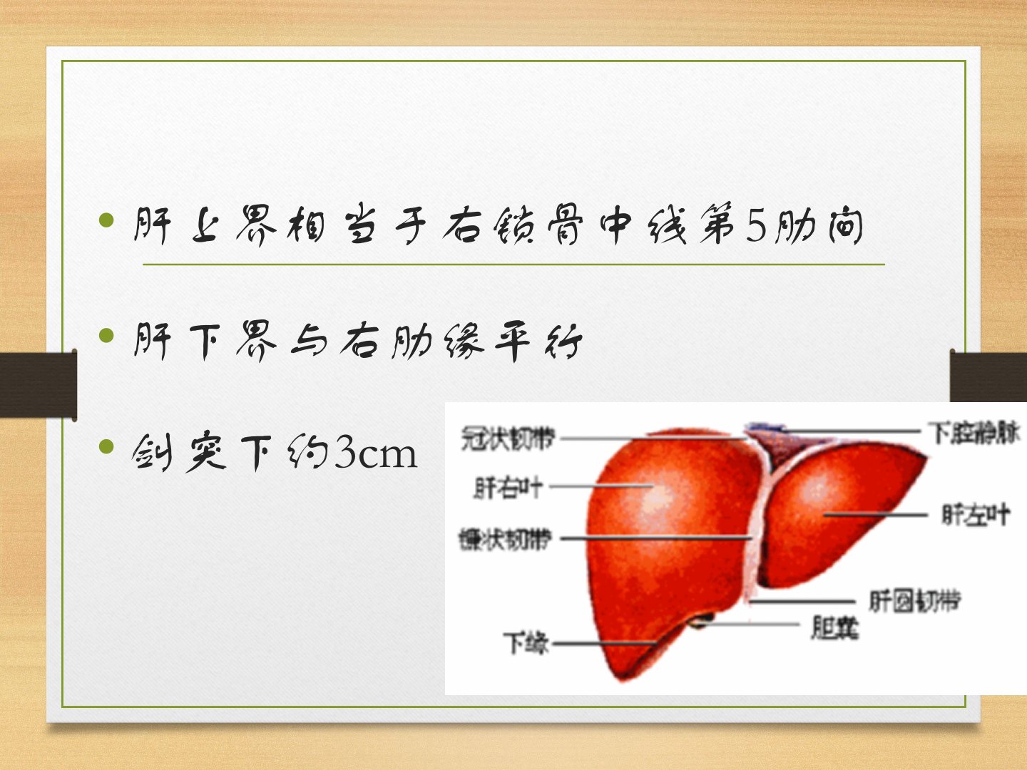 肝疾病第一节解剖生理概要(一)肝是人体内最大的实质性器官。1、左右径约25cm2、前后径15cm3、上下径6cm肝上界相当于右锁骨中线第5肋间肝下界与右肋缘平行剑突下约3cm部位:隔下上腹部(以右上腹为主)毗邻:胃、十二指肠、胆囊、结肠肝曲、右肾、肾上腺韧带:左右三角韧带、冠状韧带、镰状韧带、肝圆韧带、肝胃韧带、肝十二指肠韧带、肝结肠韧带、肝肾韧带肝大体分为4个叶Couinaud根据肝静脉和门静脉的分布及走向,将肝分为左、右两半和8个段---Couinaud分段肝的血管分布第一肝门第二肝门第三肝门肝的血液供应25%-30%来自肝动脉,70%-75%来自门静脉。肝脏的血流供应肝内有两个管道系统:...
