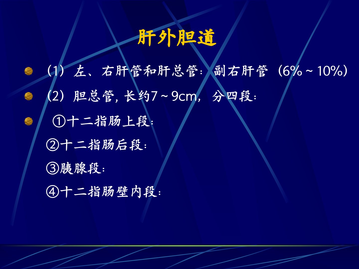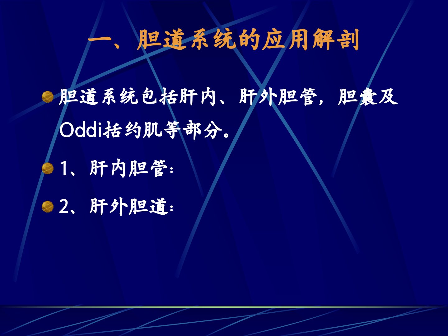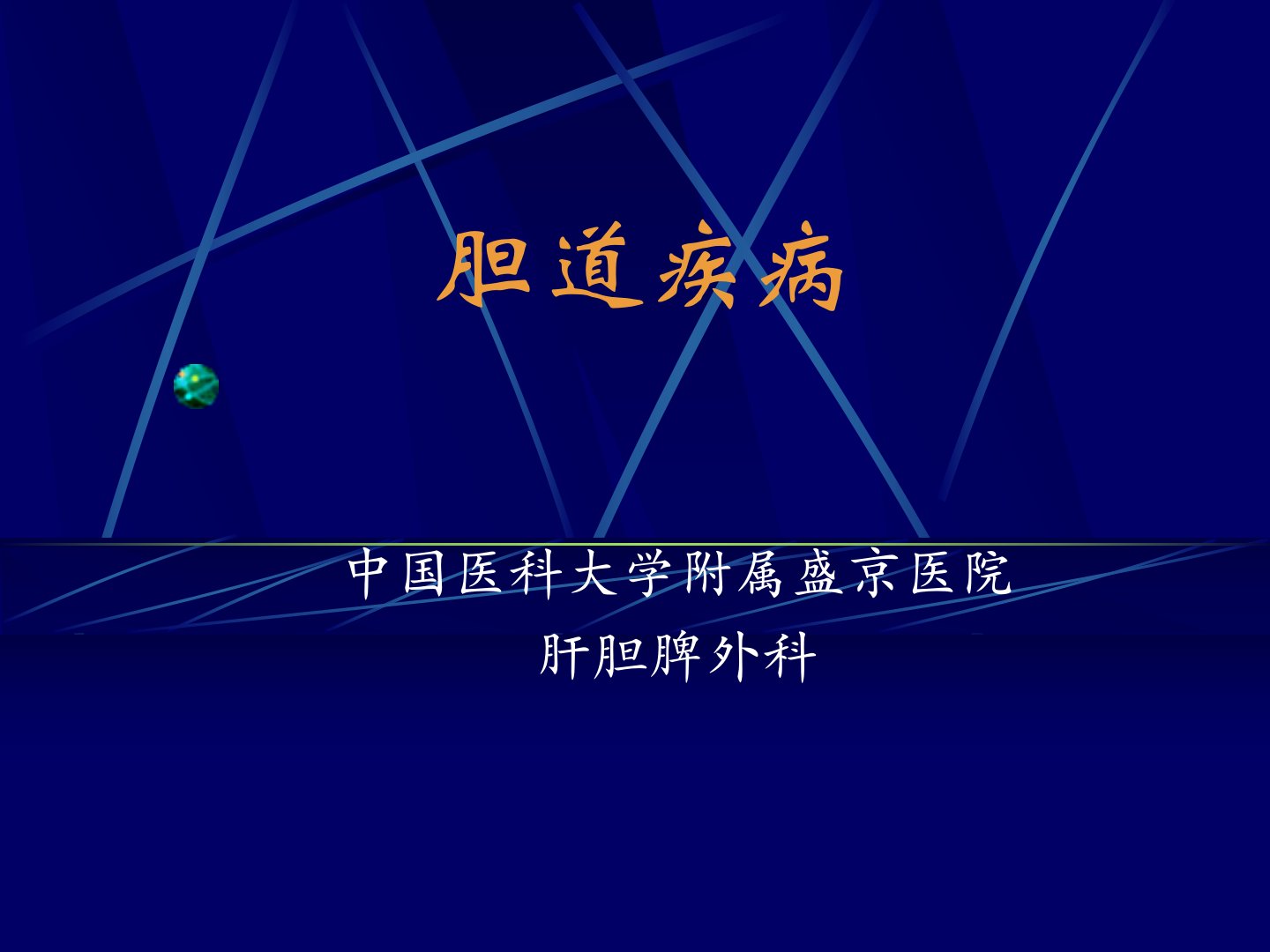 胆道疾病中国医科大学附属盛京医院肝胆脾外科一、胆道系统的应用解剖胆道系统包括肝内、肝外胆管,胆囊及Oddi括约肌等部分。1、肝内胆管:2、肝外胆道:肝外胆道(1)左、右肝管和肝总管:副右肝管(6%~10%)(2)胆总管,长约7~9cm,分四段:①十二指肠上段:②十二指肠后段:③胰腺段:④十二指肠壁内段:胆总管85%的人胆总管与主胰管在肠壁内汇合-共同通道-胆胰壶腹(Vater)壶腹括约肌(称Oddi括约肌)末端开口于十二指肠降部下1/3或中1/3处15%~20%胆总管与主胰管分别开口于十二指肠Oddi括约肌:胆管、胰管和壶腹括约肌(3)胆囊、胆囊管胆囊:容积40~60ml,分底、体、颈三部。颈...