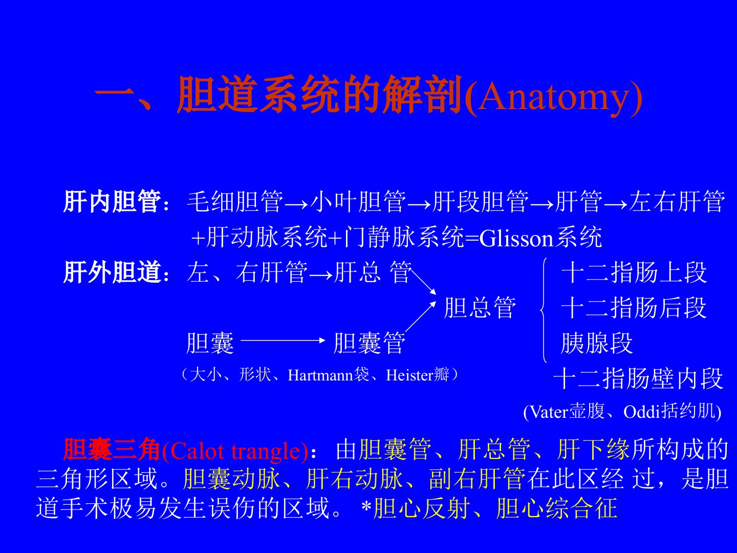 胆道疾病中南大学湘雅二医院普外科李清龙DiseasesofBiliaryTract授课内容一、胆道系统的解剖二、胆道系统的生理三、胆道疾病的特殊检查四、先天性胆道疾病五、胆石病六、胆道感染七、胆道蛔虫病八、胆道疾病的并发症九、胆管损伤十、胆道肿瘤一、胆道系统的解剖(Anatomy)肝内胆管:毛细胆管→小叶胆管→肝段胆管→肝管→左右肝管+肝动脉系统+门静脉系统=Glisson系统 肝外胆道:左、右肝管→肝总管十二指肠上段胆总管十二指肠后段胆囊胆囊管 胰腺段(大小、形状、Hartmann袋、Heister瓣)十二指肠壁内段(Vater壶腹、Oddi括约肌)胆囊三角(Calottrangle):由胆...