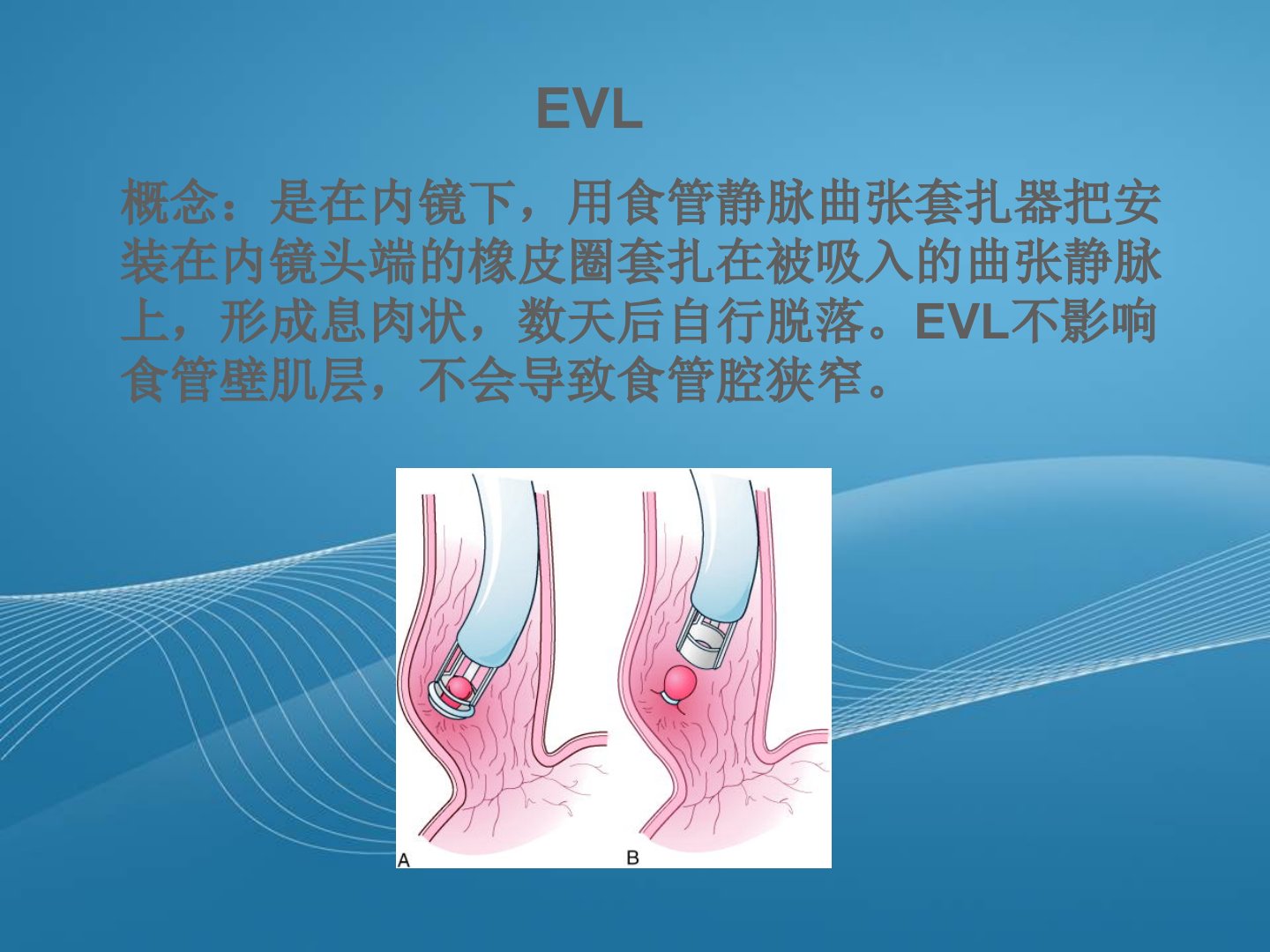 食管静脉曲张破裂出血是肝硬化门脉高压的严重并发症首次出血死亡率高反复出血发生率大。内镜下食管静脉套扎术(EVL)是控制急性出血和预防再出血的有效方法尤其适用于中度和重度静脉曲张的病人。EVL优点包括安全性高、疗效好、费用低、并发症少等。适应症包括药物止血无效者、术后再出血者、反复出血全身情况差不能耐受外科手术者及择期预防者。禁忌症有心、肺、脑、肾严重功能不全、严重出血未纠正、凝血功能障碍、食管狭窄等。术前需进行心理护理评估患者情况完善相关检查禁食并备血。术中需指导患者配合密切观察生命体征。术后需观察病情注意患者休息与活动进行基础护理和饮食护理遵医嘱使用相关药物并观察处理并发症。出院后注意休息合理饮食及时复诊就诊。