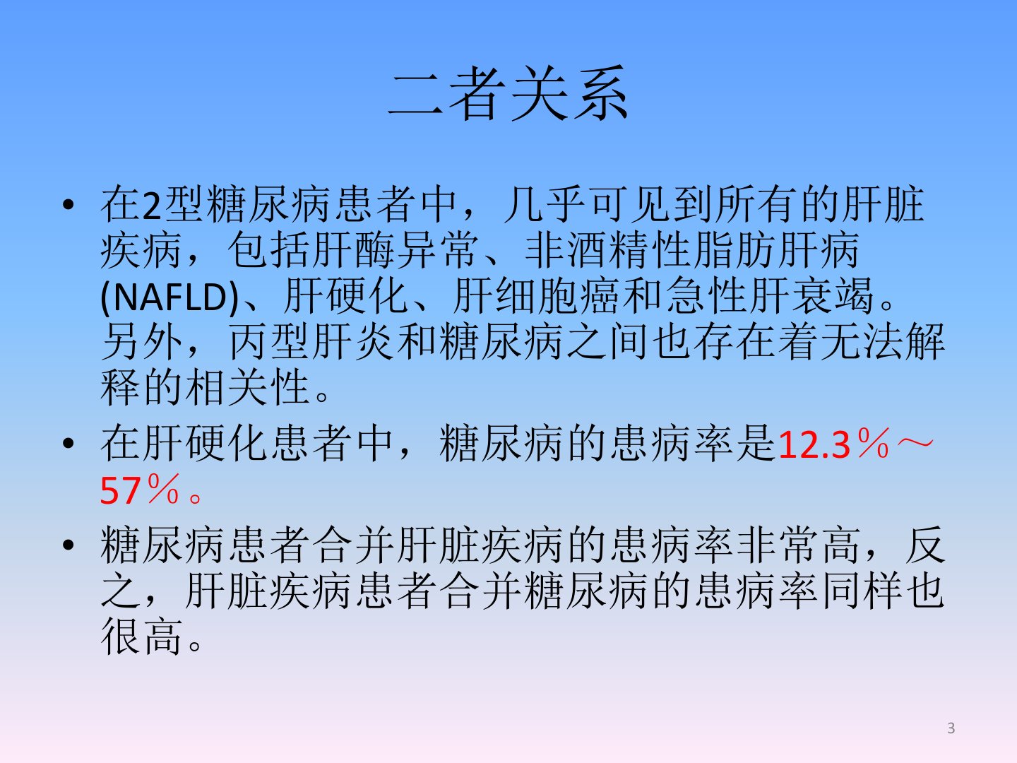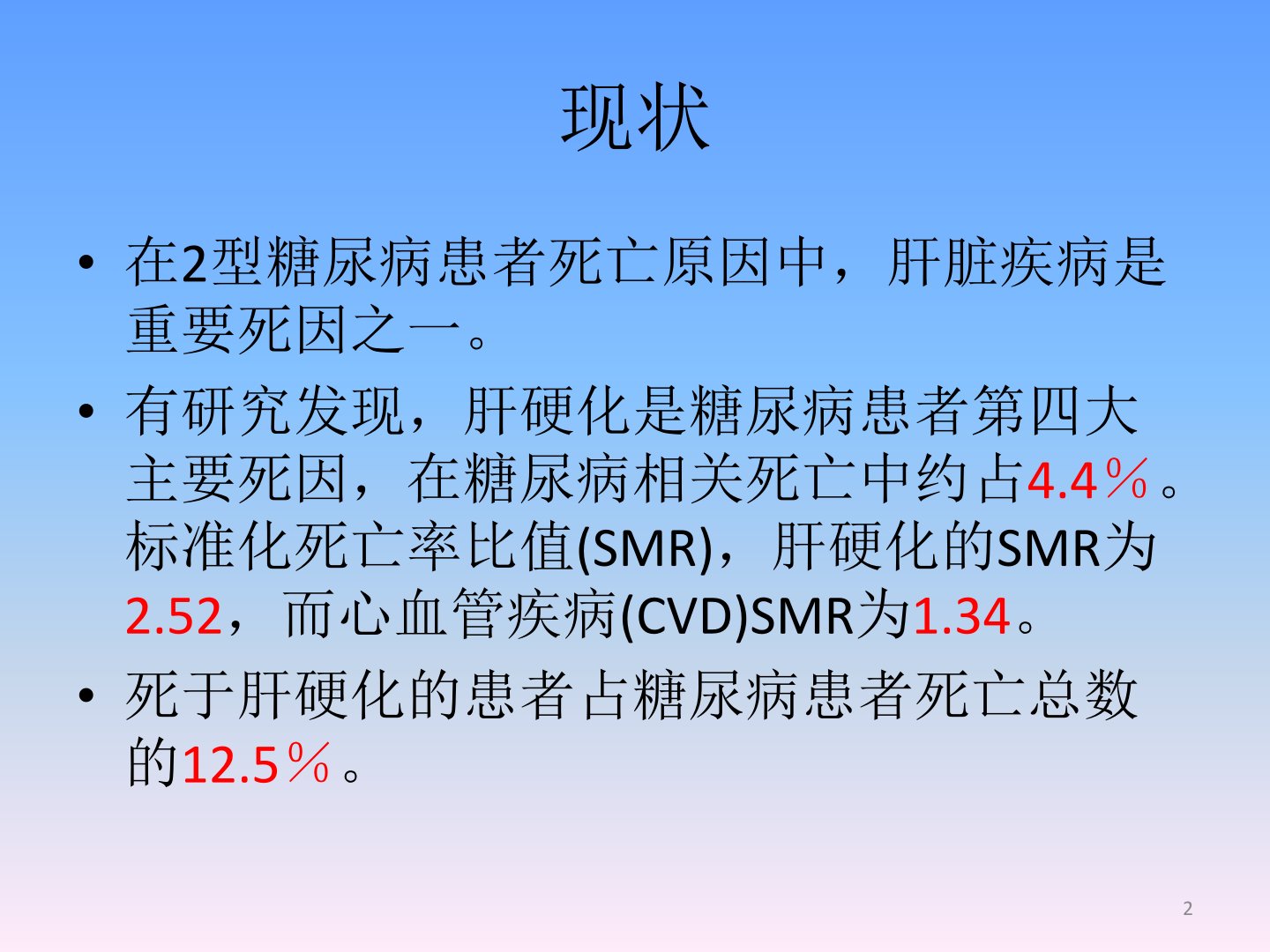 在2型糖尿病患者死亡原因中肝脏疾病是重要死因之一肝硬化是第四大死因约占糖尿病相关死亡的44。2型糖尿病患者中可见多种肝脏疾病包括肝酶异常、非酒精性脂肪肝病(NAFLD)、肝硬化、肝细胞癌、急性肝衰竭等且丙型肝炎和糖尿病间存在相关性。非酒精性脂肪肝在2型糖尿病患者中很常见其中最普遍原因是NAFLD。肝硬化患者常伴有糖耐量异常或显性糖尿病且肝硬化患者胰岛素降糖能力下降。糖尿病患者发生肝细胞癌的几率是非糖尿病患者的四倍。与背景人口相比糖尿病病人中急性肝衰竭发生率更高。此外HCV在2型糖尿病发病中可能起一定作用。在治疗方面合并肝病患者的糖尿病治疗需考虑营养状况采用低糖、低能量饮食避免低脂饮食同时需合适运动、禁酒。药物治疗需根据患者具体情况选择多数患者可选择二甲双胍但合并重度肝病或酗酒者应慎用。
