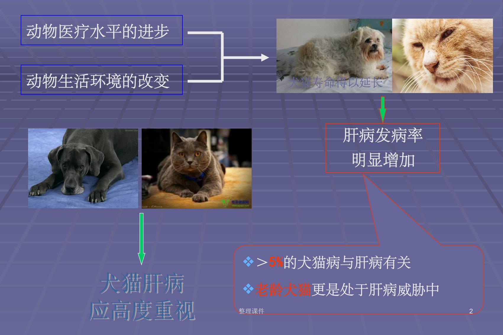 专题四聚焦犬猫肝脏疾病综合征。肝脏是维持生命活动的重要器官具有糖代谢、蛋白质代谢、脂肪代谢、解毒、吞噬、造血、贮存、合成等多种功能。猫肝脏代谢有其独特性因缺乏葡萄糖醛酸转移酶猫中毒性肝炎比犬多见。肝脏疾病病因多样包括感染性肝炎(病毒、细菌、真菌、寄生虫感染)、中毒性肝炎(药物、化学毒物、霉菌毒素中毒)、饮食性肝病、遗传性肝炎、继发性肝病等。肝病一般症状有腹围膨大、黄疸、肝性脑病等。临床病理学可参考健康犬猫肝功指标正常范围。常见疾病鉴别诊断涉及犬传染性肝炎、猫传染性腹膜炎、犬肝吸虫病等多种疾病。治疗要点包括除去病因、积极治疗原发病;保肝利胆增强肝脏解毒机能;控制感染;摘除肿瘤;对症治疗如处理腹水、止吐止泻等;治疗原发病等。