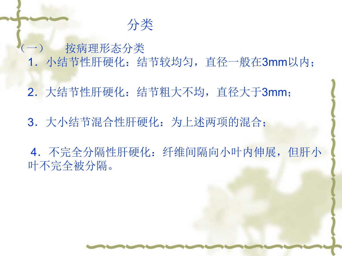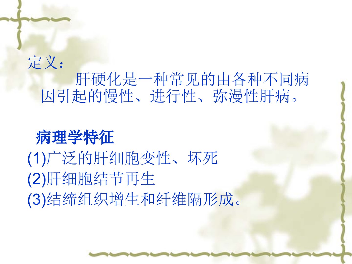 肝硬化是常见慢性、进行性、弥漫性肝病病理学特征为肝细胞变性坏死、结节再生、结缔组织增生和纤维隔形成。病理形态上肝硬化可分为小结节性、大结节性、大小结节混合性及不完全分隔性。病因上西方国家以慢性酒精中毒为主我国则主要是病毒性肝炎尤其是乙肝后肝硬化酒精性和自身免疫性肝硬化发病率也在上升。临床表现包括肝功能损害和门脉高压症如肝病面容、黄疸、出血倾向、内分泌失调等以及侧枝循环开放、腹水、胸水、脾大等。常见并发症有消化道出血、胆石症、感染、肝性脑病等。诊断依据病史、临床表现和特殊检查需与其他肝肿大、腹水、上消化道出血及神经精神症状鉴别。治疗包括一般治疗、药物治疗、腹水治疗、食管胃底静脉曲张破裂处理等乙肝后肝硬化需积极抗病毒治疗末期患者可考虑肝移植。代偿期肝硬化预后较好失代偿期预后较差死亡原因主要是静脉曲张破裂出血、肝性脑病及严重感染。